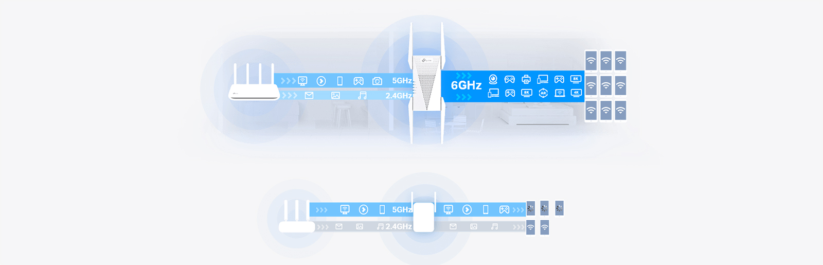 Wzmacniacz sygnału korzysta z protokołów IEEE 802.11 b/g/n/ax w paśmie 2,4 GHz, IEEE 802.11 a/n/ac/ax w 5 GHz i IEEE 802.11 ax w 6 GHz. Maksymalna teoretyczna przepustowość wynosi odpowiednio 574 Mb/s w 2,4 GHz, 2402 Mb/s w 5 GHz oraz 2402 Mb/s w 6 GHz. Jest to prawie dwukrotnie większa prędkość od tej, którą oferują rozwiązania Wi-Fi 6. Dzięki temu RE815XE to doskonałe rozwiązanie dla wymagających użytkowników. Dodatkową zaletą wykorzystania trzech pasm transmisji jest możliwość podłączenia aż 96 urządzeń klienckich jednocześnie.