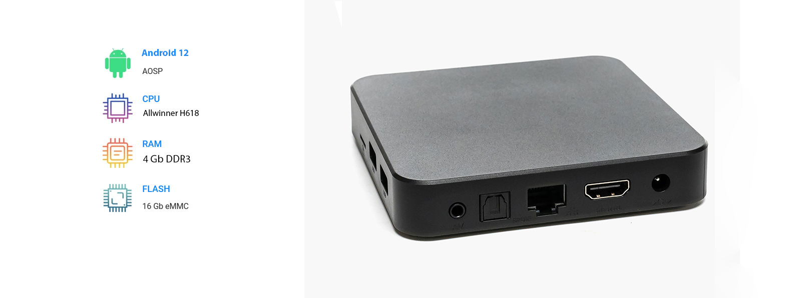 Urządzenie wyróżnia się dużą wydajnością, posiada procesor Allwinner H618 wyposażony w 4 rdzenie o taktowaniu 1,6 GHz oraz 4 GB pamięci RAM DDR3. Ważną zaletą jest 16 GB pamięci wbudowanej, dzięki której możesz zainstalować wiele aplikacji. TV5 Ultra posiada system operacyjny Android 12, umożliwi ci korzystanie z wielu popularnych aplikacji, takich jak YouTube czy Spotify.