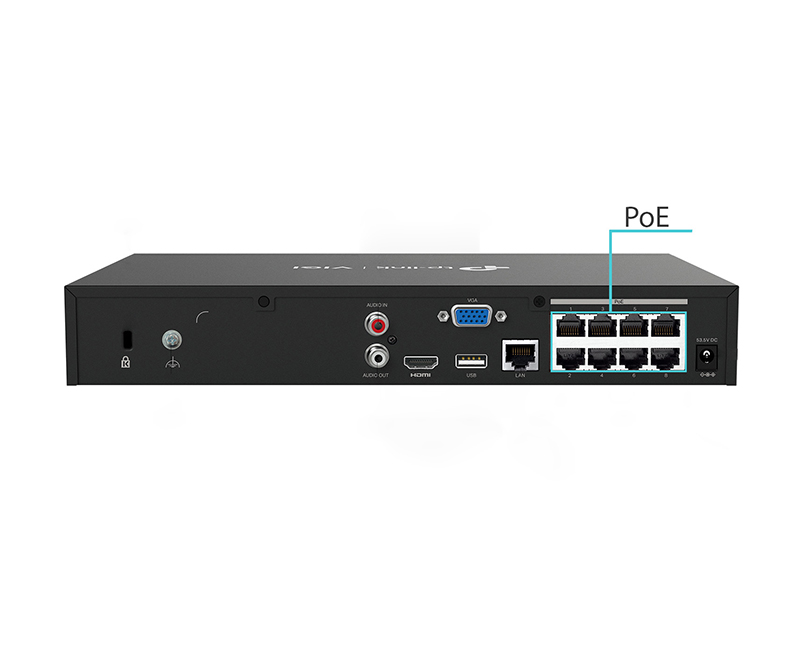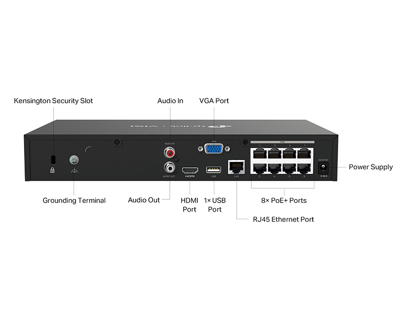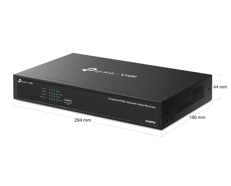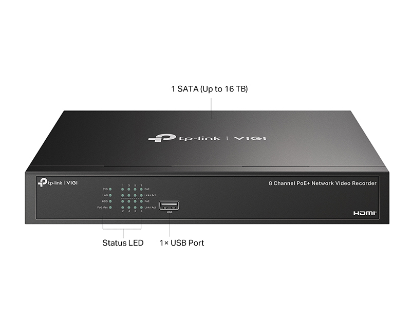 Rejestrator IP jest przystosowany do obsługi maksymalnie 8 kanałów o rozdzielczości do 8 Mpix. Obsługuje przepustowość (bitrate) do 80 Mb/s na wejściu i 60 Mb/s na wyjściu, posiada 1 złącze SATA. Maksymalna pojemność podłączonego dysku twardego wynosi 16 TB. Dysk twardy należy zakupić osobno, nie wchodzi w skład zestawu.