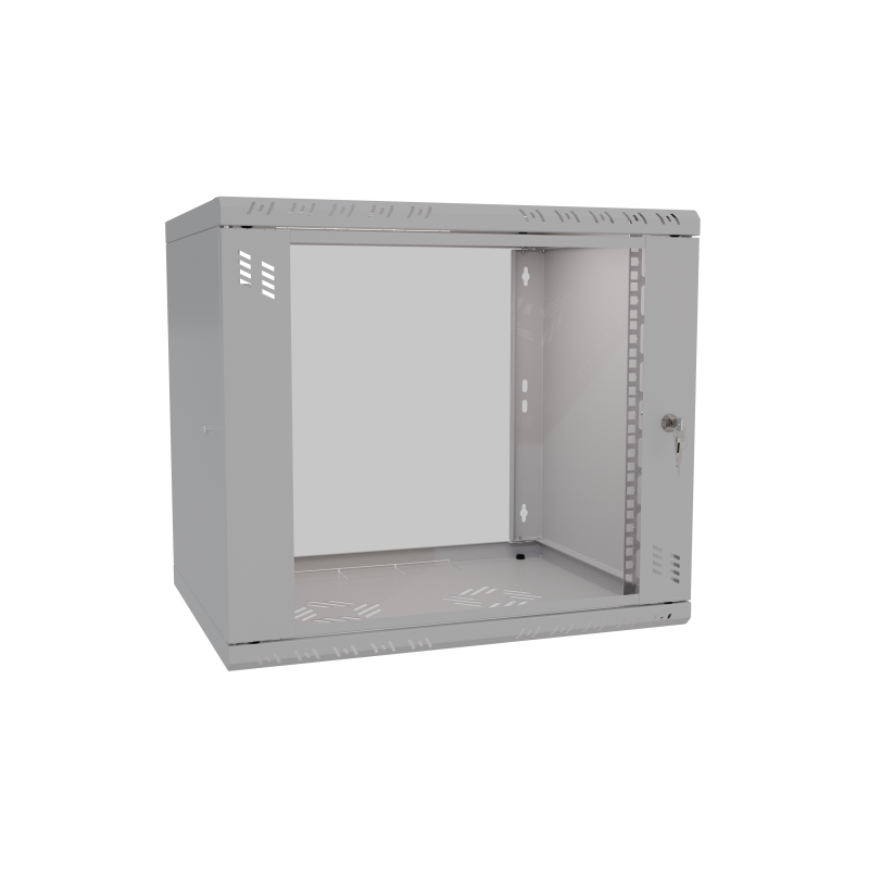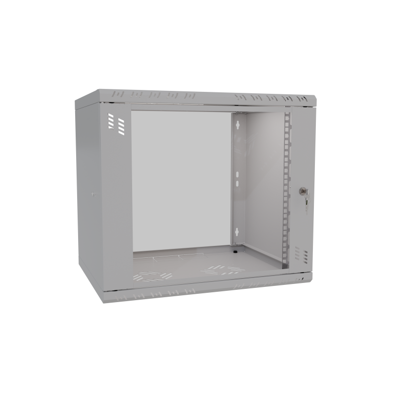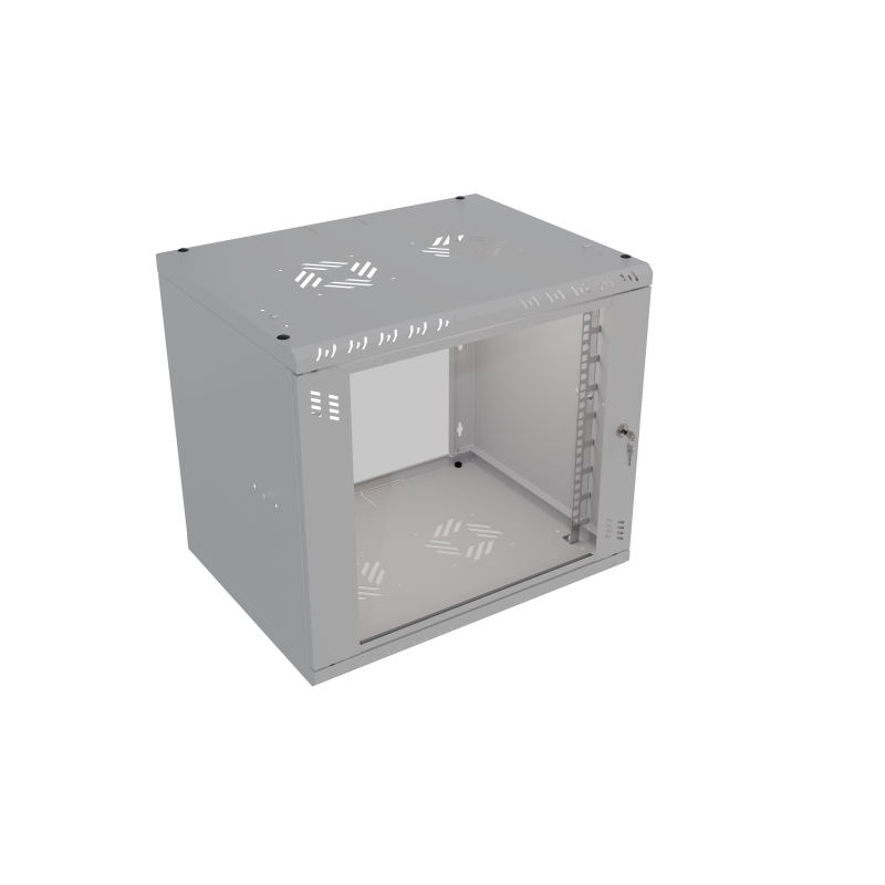 Szafę można łatwo przykręcić za pomocą kołków rozporowych (nie znajdują się w zestawie) dzięki otworom w tylnej części. Szafa umożliwia czteropunktowy montaż do ściany, co zwiększa jej stabilność. Drzwi można zamontować zarówno po prawej, jak i lewej stronie, a dzięki specjalnym zawiasom ze sprężyną ich montaż i demontaż jest niezwykle prosty. Szyny RACK można zamontować na trzech głębokościach, co pozwala na swobodne dopasowanie do urządzeń wewnątrz. W górnej i dolnej części znajdują się miejsca na wentylatory 120x120 mm (rozstaw otworów 105x105 mm), co zapewnia odpowiednie chłodzenie urządzeń. Dodatkowo, wyłamywane przepusty kablowe 50x80 mm (3 sztuki w górnej i 3 sztuki w dolnej części) ułatwiają zarządzanie okablowaniem. Szafa jest wyposażona w perforacje od frontu i po bokach, co jest kluczowe dla odprowadzania ciepła.