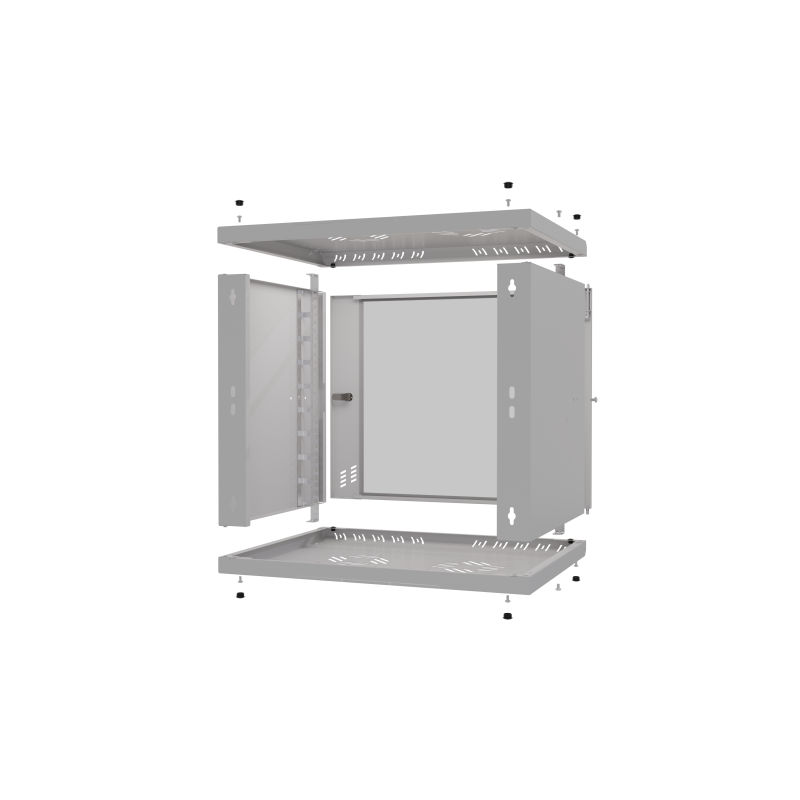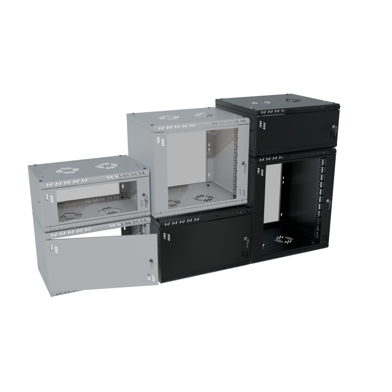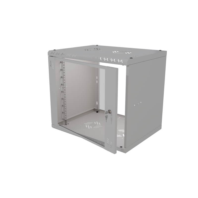 Szafa wykonana jest z blachy, która gwarantuje sztywność, a jednocześnie jest na tyle lekka, że jedna osoba może przeprowadzić instalację. Celowe usunięcie tylnej ściany umożliwia wygodną modernizację oraz zapewnia łatwy dostęp do okablowania wychodzącego ze ściany. Liczne otwory w szynach RACK pozwalają na łatwe przeprowadzenie okablowania. Dzięki swojej kompaktowej szerokości wynoszącej zaledwie 520 mm, szafa idealnie nadaje się do miejsc o ograniczonej przestrzeni, pozostając w pełni funkcjonalną.