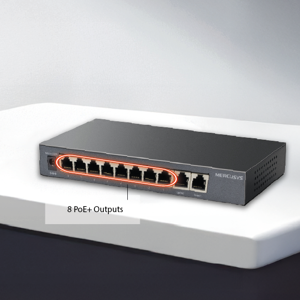 8 portów RJ45 PoE+ 10/100/1000 Mb/s 2 porty RJ45 Uplink 1000 Mb/s Automatyczna negocjacja Automatyczne MDI/MDIX |