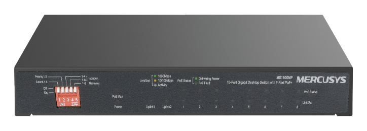 Mercusys MS110GMP to switch wyposażony w 10 gigabitowych portów Ethernet (10/100/1000 Mb/s), na portach 1 - 8 znajduje się wyjście zasilania PoE+ (802.3af/at). Maksymalna moc wyjściowa na porty wynosi 15,4 W przy 802.3af lub 30 W przy 802.3at, łączny budżet zasilania (na wszystkie porty) to 111 W. Switch nie posiada zarządzania, ale obsługuje różne tryby pracy, w tym Extend pozwalający na zwiększenie zasięgu PoE do 250 m (kosztem ograniczenia przepustowości do 10 Mb/s) oraz PoE Auto Recovery, które automatycznie restartuje podłączone urządzenia jeżeli te przestaną odpowiadać. MS110GMP ma niewielką obudowę typu desktop i korzysta z pasywnego chłodzenia. W zestawie znajdziesz zasilacz 53,5 V DC / 2,43 A.