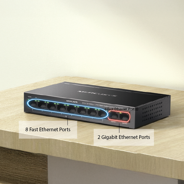 8 portów Fast Ethernet, 2 porty Gigabit Ethernet