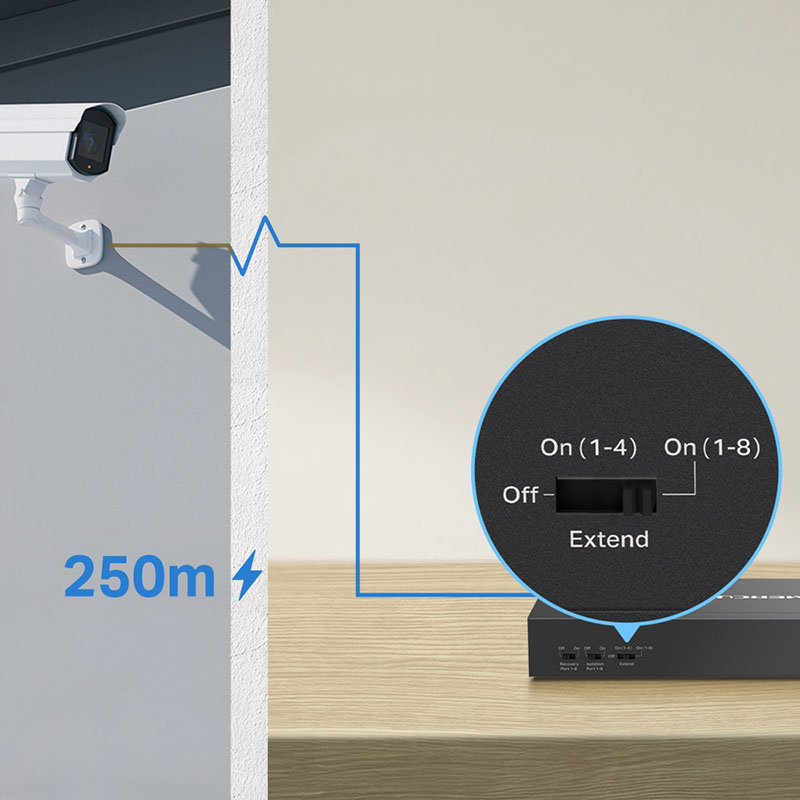 W trybie Extend porty 1 - 4 lub wszystkie (1 - 8) wspierają transmisję Long-Range - z zasięgiem PoE do 250 metrów. Przepustowość portów ustawionych w trym trybie spada do 10 Mb/s. Należy pamiętać, że zasięg jest w dużej mierze uzależniony od jakości zastosowanego okablowania.