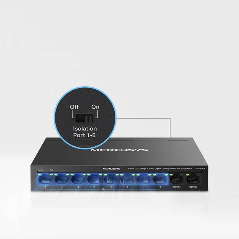 Po włączeniu trybu izolacji interfejsy 1 - 8 nie mogą komunikować się ze sobą, mogą prowadzić transmisję tylko z portami 9 i 10. Tryb ma na celu zwiększenie bezpieczeństwa sieci.