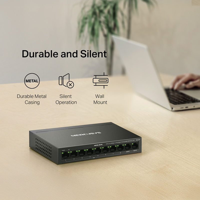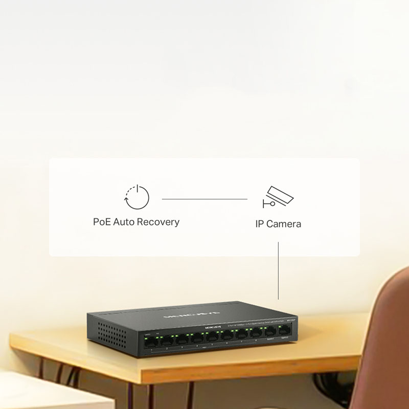 Mercusys MS110CP to switch wyposażony w 8 portów fast Ethernet (10/100 Mb/s) oraz 2 gigabitowe porty Ethernet (10/100/1000 Mb/s), Na wszystkich portach fast Ethernet (1 - 8) znajduje się wyjście zasilania PoE+ (802.3af/at). Maksymalna moc wyjściowa na port wynosi 15,4 W przy 802.3af lub 30 W przy 802.3at, łączny budżet zasilania (na wszystkie porty) to 65 W). Switch nie posiada zarządzania, ale obsługuje różne tryby pracy, w tym Extend pozwalający na zwiększenie zasięgu PoE do 250 m (kosztem ograniczenia przepustowości do 10 Mb/s) oraz PoE Auto Recovery, która automatycznie restartuje podłączone urządzenia jeżeli te przestaną odpowiadać. MS110CP ma niewielką obudowę typu desktop i korzysta z pasywnego chłodzenia. W zestawie znajdziesz zasilacz 53,5 V DC / 1,31 A.