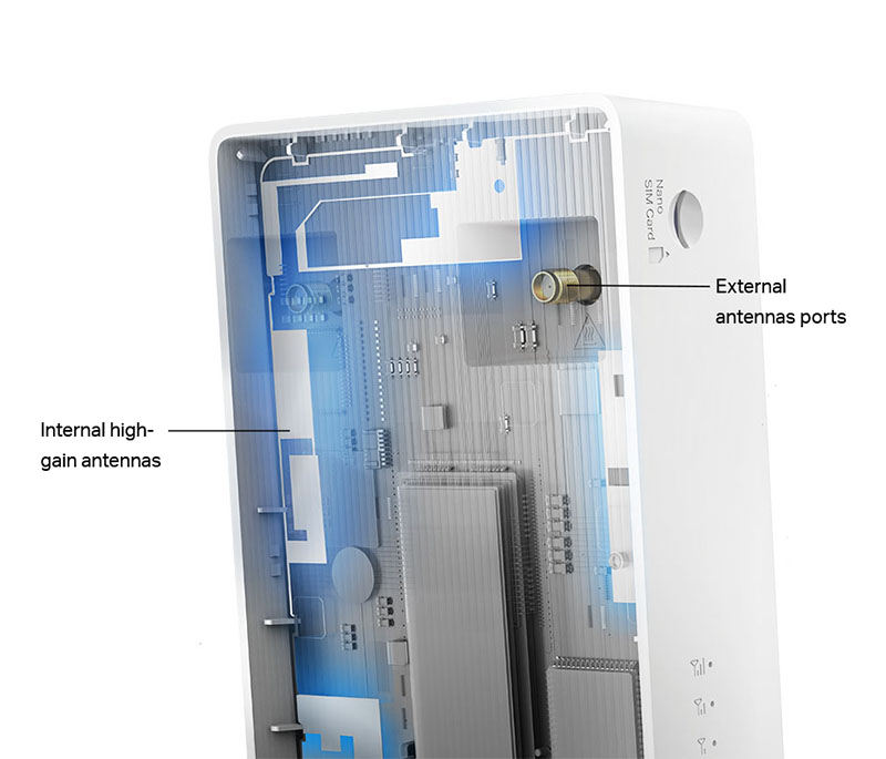 Zintegrowane anteny LTE o dużym zysku zapewniają stabilne połączenie bez okresowych strat sygnału. Router poradzi sobie dużo lepiej z transmisją mobilną od standardowego telefonu, pomoże w miejscach, w których dostęp do połączenia LTE jest utrudniony. Dodatkowo wewnątrz obudowy posiada złącza pozwalające podłączyć antenę zewnętrzną w celu zwiększenia zasięgu.