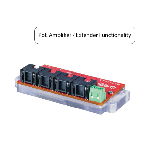 Z uwagi na zastosowanie wejściowego portu PoE urządzenie może pracować jako ekstender PoE. Pozwoli uzyskać łączny zasięg 200 m przy wykorzystaniu standardowego kabla Ethernet zakładając, że odcinek pomiędzy zasilaczem / switchem a APT-4-11 wynosi do 100 m i odcinek pomiędzy APT-4-11 a urządzeniami końcowymi również wynosi do 100 m.