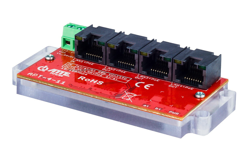 ATTE APT-4-11 to switch / extender wyposażony w 4 porty fast Ethernet (10/100 Mb/s). Na pierwszym porcie posiada wejście zasilania PoE++ (802.3af/at/bt), a na trzech pozostałych wyjścia zasilania PoE+ (802.3af/at). Pozwoli ci podłączyć trzy kamery IP z wykorzystaniem jednego portu w głównym switchu zasilającym, a dodatkowo zwiększyć zasięg zasilania PoE. Maksymalna moc wyjściowa zasilania jest uzależniona od standardu PoE podawanego na wejściu i wynosi około 13 W przy 802.3af, 25 W przy 802.3at lub 51 W przy 802.3bt. Jest to moc w zupełności wystarczająca do podłączenia trzech kamer IP, a nawet innych urządzeń, z większym poborem prądu. Switch nie posiada obudowy, jest przystosowany głównie do montażu w skrzynce z wykorzystaniem kołków / wkrętów, wyróżnia się dużym zakresem temperatury pracy (-25°C do 65°C).