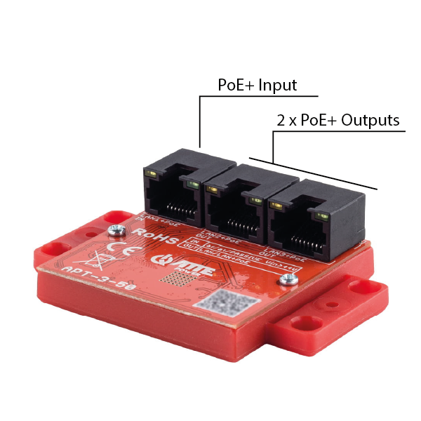 Switch został wyposażony w łącznie 3 gigabitowe porty Ethernet (10/100/1000 Mb/s). Na pierwszym z nich znajduje się wejście zasilania PoE+ (802.3af/at), na dwóch pozostałych wyjścia PoE+ (802.3af/at). Moc wyjściowa jest uzależniona od standardu PoE na wejściu. W przypadku korzystania z 802.3af APT-3-50 ma do dyspozycji około 13 W, przy 802.3at jest to około 25 W.