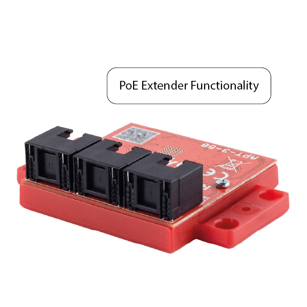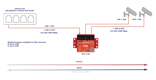 Z uwagi na zastosowanie wejściowego portu PoE urządzenie może pracować jako ekstender PoE. Pozwoli uzyskać łączny zasięg 200 m przy wykorzystaniu standardowego kabla Ethernet zakładając, że odcinek pomiędzy zasilaczem / switchem a APT-3-50 wynosi do 100 m i odcinek pomiędzy APT-3-50 a urządzeniami końcowymi również wynosi do 100 m.
