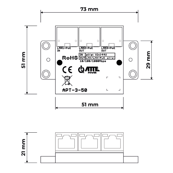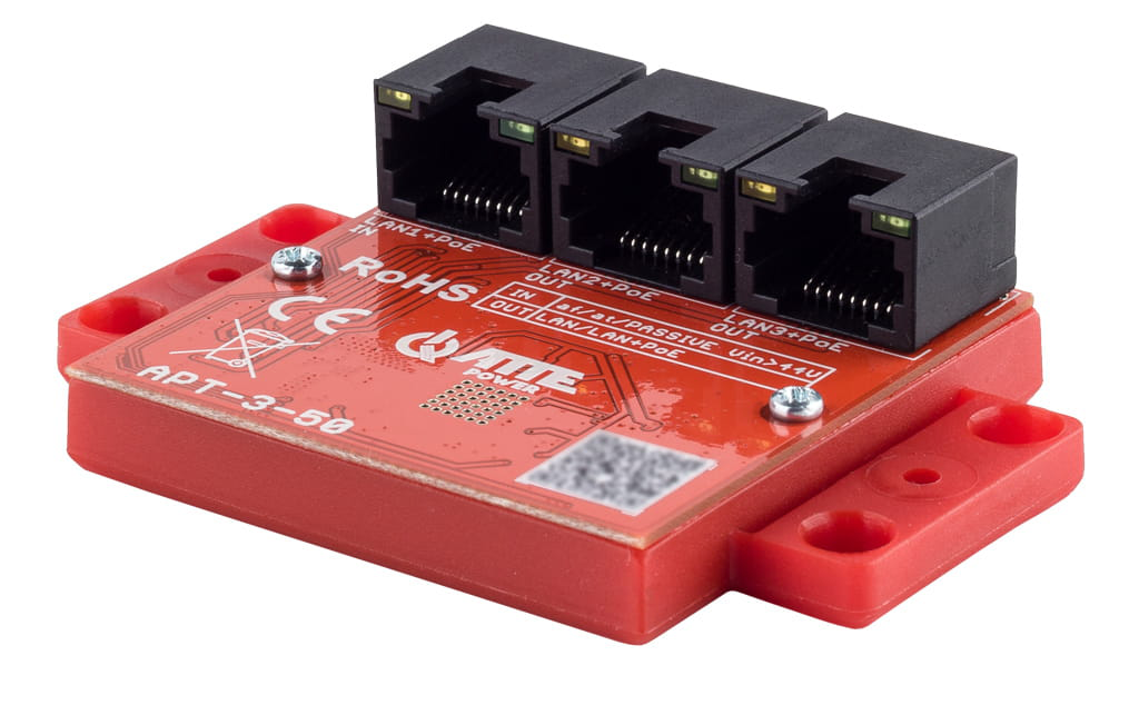 ATTE APT-3-50 to switch / extender wyposażony w 3 gigabitowe porty Ethernet (10/100/1000 Mb/s). Na pierwszym porcie posiada wejście PoE+ (802.3af/at), a na dwóch pozostałych wyjścia zasilania PoE+ (802.3af/at). Pozwoli ci podłączyć dwa urządzenia z wykorzystaniem jednego portu w głównym switchu zasilającym, a dodatkowo zwiększyć zasięg zasilania PoE. Dzięki gigabitowym portom zastosowanie switcha nie ogranicza się tylko do podłączania kamer IP, z powodzeniem sprawdzi się np. do podłączania punktów dostępowych. Maksymalna moc wyjściowa zasilania jest uzależniona od standardu PoE podawanego na wejściu i wynosi około 13 W przy 802.3af lub 25 W przy 802.3at. Jest to moc w zupełności wystarczająca do podłączenia dwóch urządzeń. Switch nie posiada obudowy, jest przystosowany do montażu w skrzynce z wykorzystaniem kołków / wkrętów, wyróżnia się dużym zakresem temperatury pracy (-25°C do 65°C).