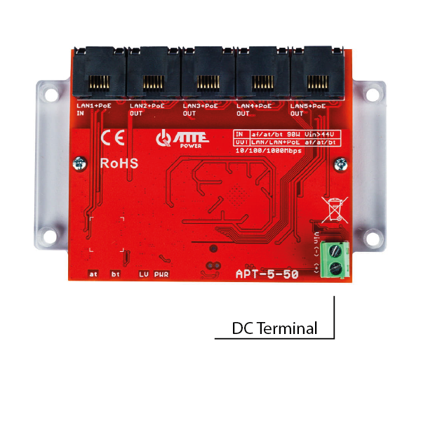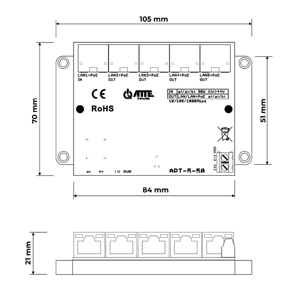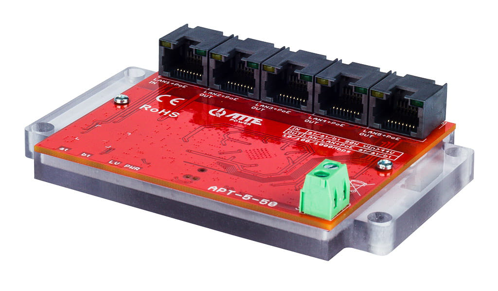 ATTE APT-5-5o to switch / extender wyposażony w 5 gigabitowych portów Ethernet (10/100/1000 Mb/s). Na pierwszym porcie posiada wejście PoE+++ (802.3 af/at/bt type3/bt type4), a na czterech pozostałych wyjścia zasilania PoE++ (802.3af/at/bt type3). Pozwoli ci podłączyć cztery urządzenia z wykorzystaniem jednego portu w głównym switchu zasilającym, a dodatkowo zwiększyć zasięg zasilania PoE. Dzięki gigabitowym portom zastosowanie switcha nie ogranicza się tylko do podłączenia kamer IP, z powodzeniem sprawdzi się np. do podłączenia punktów dostępowych. Maksymalna moc wyjściowa zasilania jest uzależniona od standardu PoE podawanego na wejściu i wynosi około 13 W przy 802.3af, 25 W przy 802.3at, 51 W przy 802.3bt type 3 lub 71 W przy 802.3bt type3. Jest to moc w zupełności wystarczająca do zasilania kilku AP, korzystając z PoE+++ uzyskasz ponad 17 W mocy wyjściowej na port. Switch nie posiada obudowy, jest przystosowany do montażu w skrzynce z wykorzystaniem kołków / wkrętów, wyróżnia się dużym zakresem temperatury pracy (-25°C do 60°C).