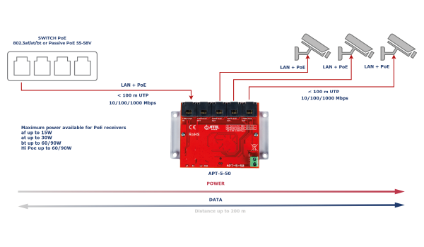 Z uwagi na zastosowanie wejściowego portu PoE urządzenie może pracować jako ekstender PoE. Pozwoli uzyskać łączny zasięg 200 m przy wykorzystaniu standardowego kabla Ethernet zakładając, że odcinek pomiędzy zasilaczem / switchem a APT-5-50 wynosi do 100 m i odcinek pomiędzy APT-5-50 a urządzeniami końcowymi również wynosi do 100 m.