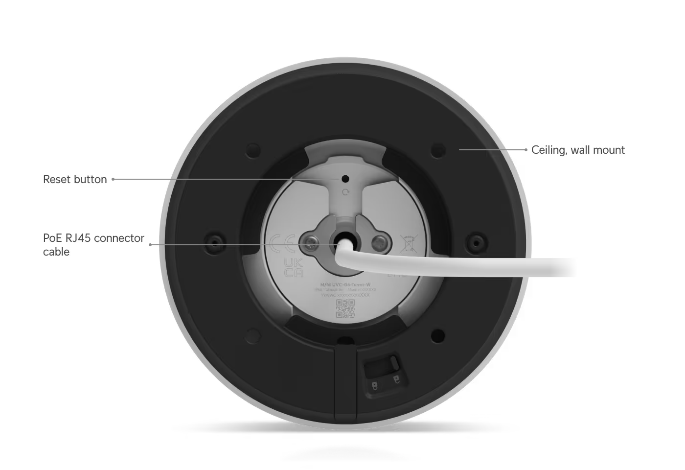 Urządzenie jest wyposażone w 1 port 100M Ethernet (10/100 Mb/s), który jednocześnie służy za wejście zasilania PoE (802.3af). Maksymalny pobór mocy wynosi 12,5 W, zasilania nie możesz doprowadzić w inny sposób niż poprzez PoE. Kamera posiada wyprowadzony na zewnątrz kabel Ethernet o długości 30 cm zakończony złączem RJ45. Na zakończeniu znajduje się specjalna hermetyczna obudowa, która pozwoli ci podłączyć kabel bez obaw o wnikanie wody / wilgoci.