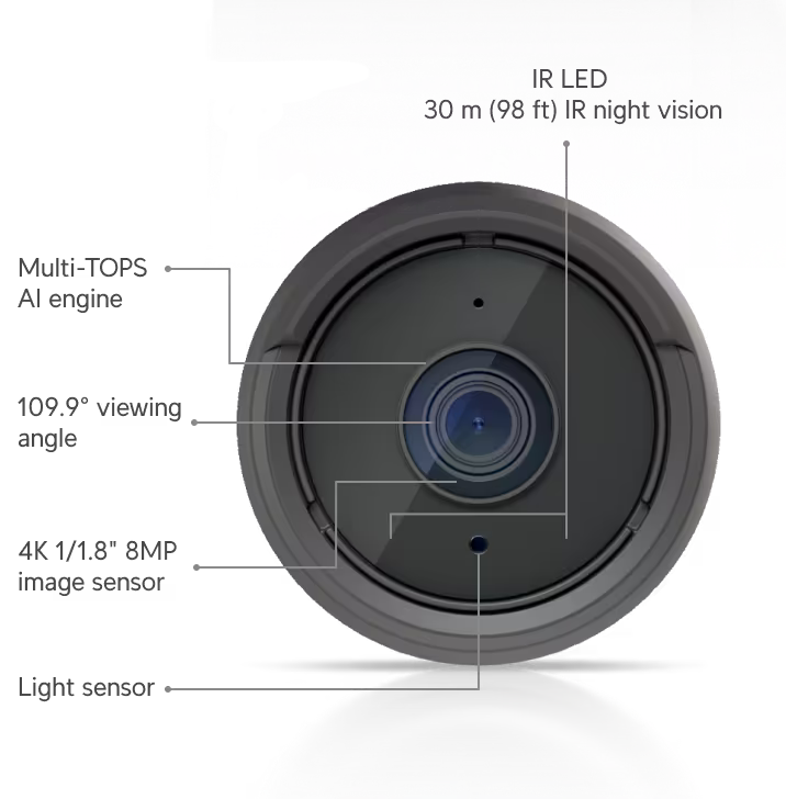 Oferowany produkt to kamera IP wyposażona w obiektyw 8 Mpix wspierający rozdzielczość 4K. Zapewnia bardzo wysoką jakość obrazu, pozwala na dostrzeżenie szczegółów, które przy niższej rozdzielczości byłyby całkowicie nieczytelne. Zastosowano stałoogniskowy obiektyw, kąt widzenia wynosi 109,9° poziomo i 56,7° pionowo, przekątna to 134,1°. Zakres nagrywania jest wystarczająco szeroki do większości zastosowań.