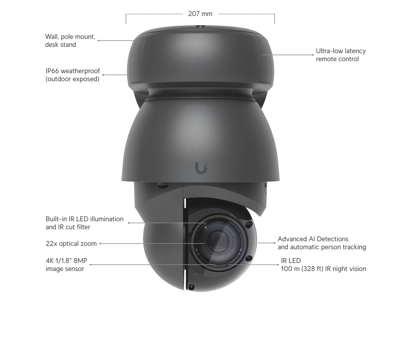 AI PTZ Industrial to kamera przystosowana do pracy pod kontrolą systemu UniFi Protect. Wymaga zaadaptowania w panelu kontrolnym i zastosowania rejestratora kompatybilnego z UniFi lub gateway'a z funkcją rejestratora. Kamerą możesz w wygodny sposób zarządzać z poziomu tego samego panelu co punktami dostępowymi i innymi urządzeniami z bogatej gamy rozwiązań Ubiquiti UniFi.