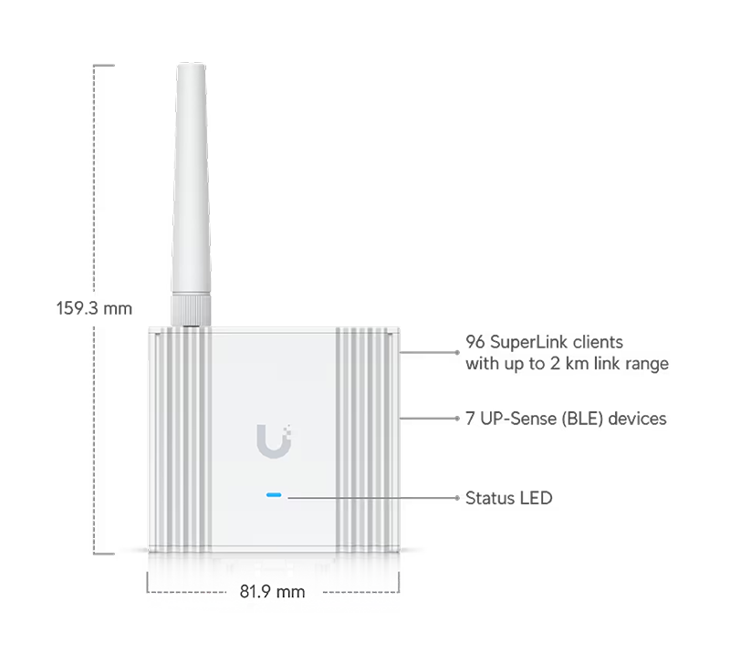 Do UP-SuperLink możesz podłączyć 96 klientów obsługujących technologię SuperLink oraz do 7 klientów Bluetooth, w tym UP-Sense. SuperLink wyróżnia się bardzo dużym zasięgiem transmisji, wg danych producenta przy zachowaniu widoczności optycznej zasięg sięga nawet 2 km.