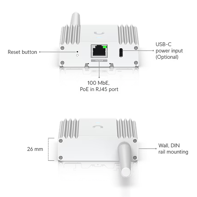 Urządzenie do komunikacji posiada 1 port fast Ethernet (10/100 Mb/s), który jednocześnie służy za wejście zasilania PoE (802.3af). Zasilanie możesz doprowadzić również korzystając z portu USB-C (5 V / 1 A), maksymalny pobór mocy wynosi zaledwie 3,4 W. Zasilacz nie jest dołączony w zestawie i należy zakupić go osobno.