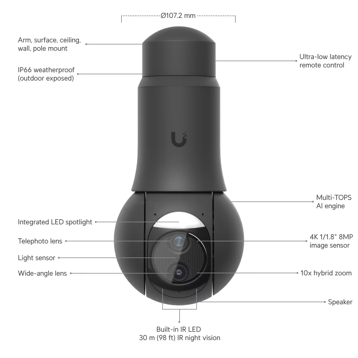 Urządzenie wspiera zaawansowane funkcje AI oferowane przez UniFi Protect. Najważniejsze z nich to rozpoznawanie twarzy, rozpoznawanie tablic rejestracyjnych oraz inteligentne wykrywanie zwierząt, ludzi i pojazdów. Oprócz tego kamera obsługuje podstawowe funkcje, takie jak wykrywanie ruchu i przekroczenia linii. Możliwość automatycznego odczytywania tablic rejestracyjnych i rozpoznawania twarzy bardzo pomaga podczas późniejszego przeglądania monitoringu, umożliwia prowadzenie precyzyjnego śledzenia danych osób / obiektów.