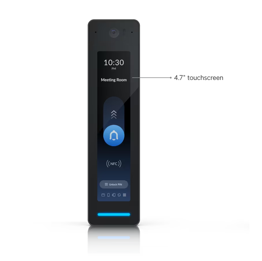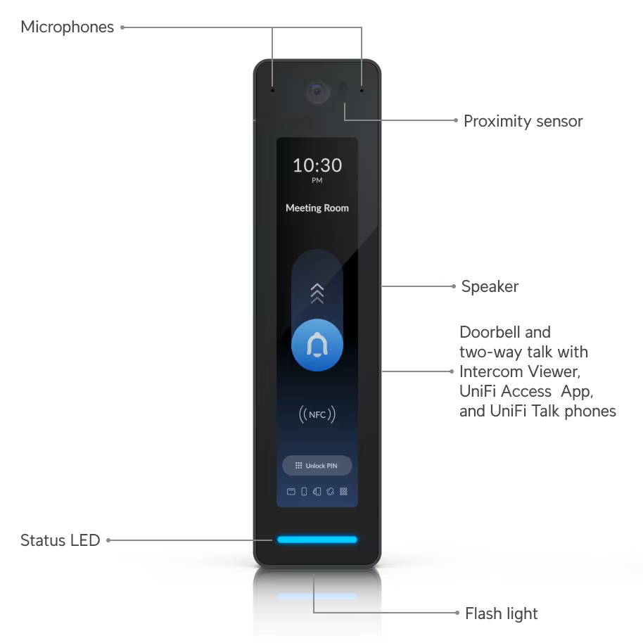 G3 Reader Pro posiada wbudowaną kamerę, mikrofon oraz głośnik. Pozwala prowadzić dwukierunkową komunikację głosową z podglądem obrazu, w podobny sposób jak w standardowych wideodomofonach. Rozmowę wywołaną z poziomu czytnika możesz odebrać w aplikacji UniFi Access, urządzeni Intercom Viewer lub telefonach z serii UniFi Talk. Następnie możesz otworzyć dane drzwi przed gościem.
