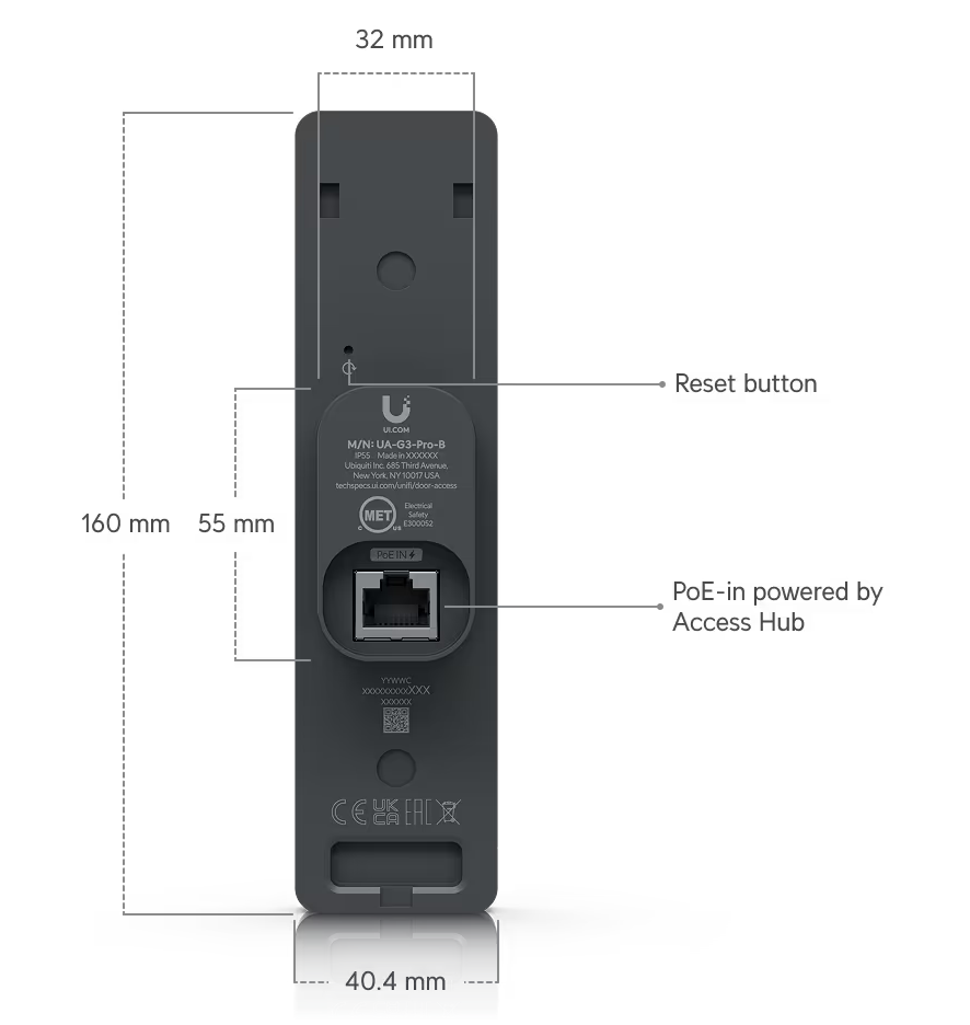 Z tyłu obudowy znajduje się port 1G Ethernet, który jednocześnie służy za wejście zasilania PoE (802.3af). Zasilania nie możesz doprowadzić do urządzenia w inny sposób. G3 Reader Pro wyróżnia się bardzo małym poborem mocy - 6 W. Urządzenie zostało przystosowane do montażu na puszce elektrycznej / instalacyjnej. Jeżeli chcesz zamontować je bezpośrednio na ścianie musisz skorzystać z opcjonalnych uchwytów.
