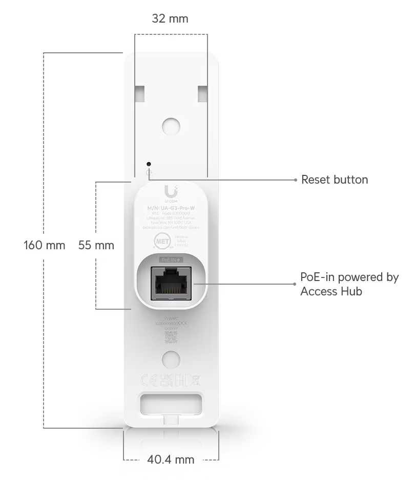 Z tyłu obudowy znajduje się port 1G Ethernet, który jednocześnie służy za wejście zasilania PoE (802.3af). Zasilania nie możesz doprowadzić do urządzenia w inny sposób. G3 Reader Pro wyróżnia się bardzo małym poborem mocy - 6 W. Urządzenie zostało przystosowane do montażu na puszce elektrycznej / instalacyjnej. Jeżeli chcesz zamontować je bezpośrednio na ścianie musisz skorzystać z opcjonalnych uchwytów.