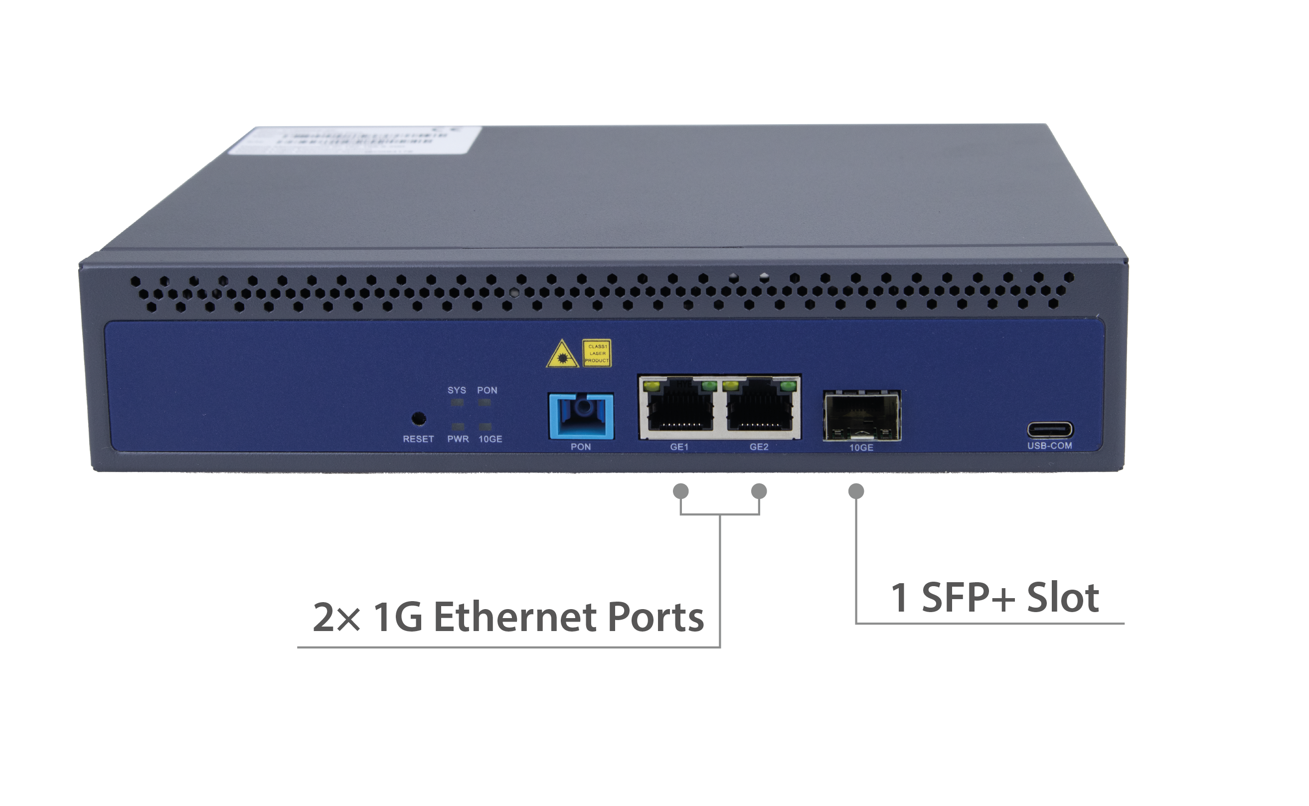 Terminal został wyposażony w łącznie trzy porty uplinkowe: 1 slot SFP+ (10 Gb/s) oraz 2 porty 1G Ethernet (10/100/1000 Mb/s). Port optyczny doskonale sprawdzi się podczas korzystania z urządzenia w odległej lokalizacji, którą trzeba połączyć kablem światłowodowym.