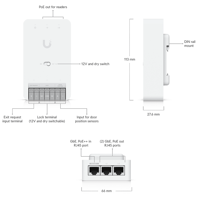 W zestawie znajdziesz hub przeznaczony do obsługi jednej party drzwi. Wymaga skorzystania z kompatybilnego zamka elektrycznego lub magnetycznego (możesz skorzystać z rozwiązań Ubiquiti lub innych producentów). Wersja Mini jest prostsza od standardowego Door Huba, nie ma złącza alarmowego i została wyposażona w mniejszą liczbę przekaźników. Urządzenie posiada 3 gigabitowe porty Ethernet (10/100/1000 Mb/s), na pierwszym z nich znajduje się wejście zasilania PoE++ (802.3bt), a na pozostałych wyjście zasilania PoE (802.3af), łączny, maksymalny budżet wyjściowy PoE wynosi 45 W. Dzięki temu do huba możesz podłączyć i jednocześnie zasilać dwa czytniki.