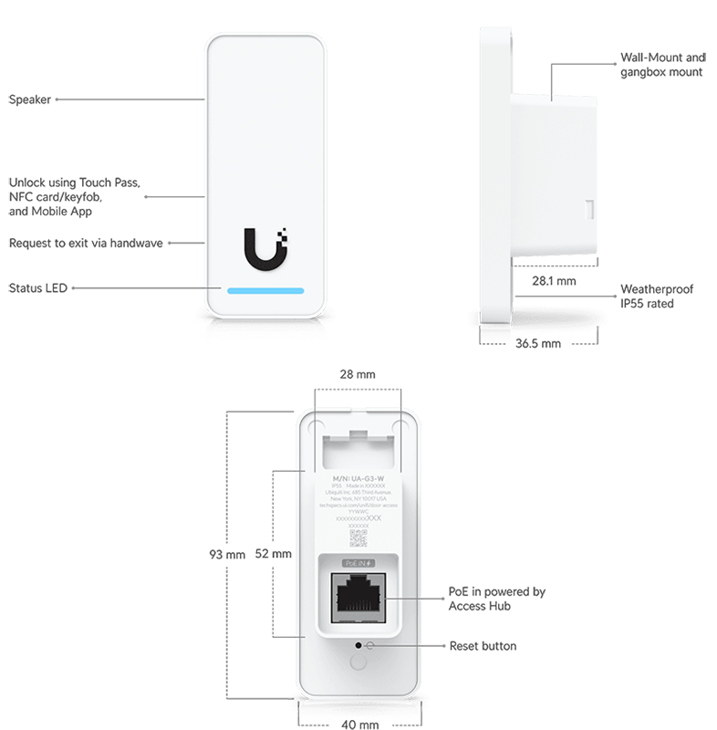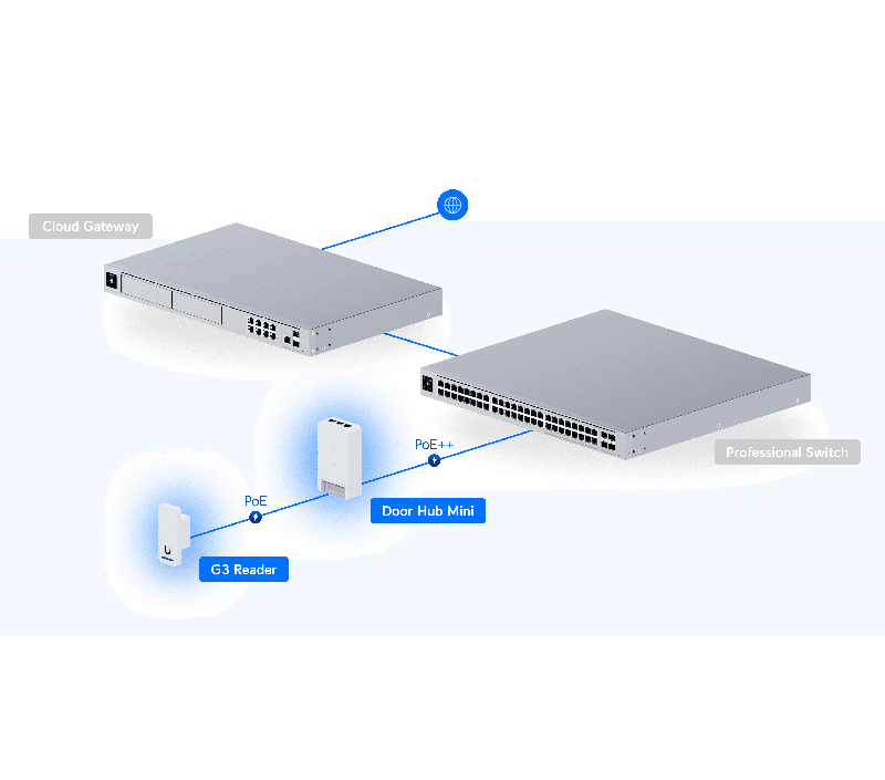 Ubiquiti G3 Starter Kit to podstawowy zestaw startowy przeznaczony do systemu UniFi Access. Składa się z Door Huba Mini, jednego czytnika G3 Reader oraz dodatkowo 2 kart NFC typu keyfob. Pozwoli ci kontrolować stan otwarcia jednej pary drzwi, ale będzie wymagał zapienia dodatkowego czytnika lub przycisku dla osób wychodzących z danej lokalizacji. Zestaw możesz połączyć z kompatybilnym zamkiem elektrycznym / magnetycznym Ubiquiti lub innej marki. Dołączony czytnik umożliwia otwieranie drzwi przy pomocy kart NFC / keyfob, Touch Pass (przyłożenie telefonu) lub aplikacji mobilnej, wspiera także żądanie otwarcia przez machnięcie ręką. Door Hub Mini został wyposażony w 3 gigabitowe porty Ethernet (10/100/1000 Mb/s), pierwszy z nich posiada wejście zasilania PoE++ (802.3bt), na dwóch pozostałych znajduje się wyjście zasilania PoE (802.3af). Dzięki temu do huba możesz podłączyć i jednocześnie zasilić dwa czytniki.