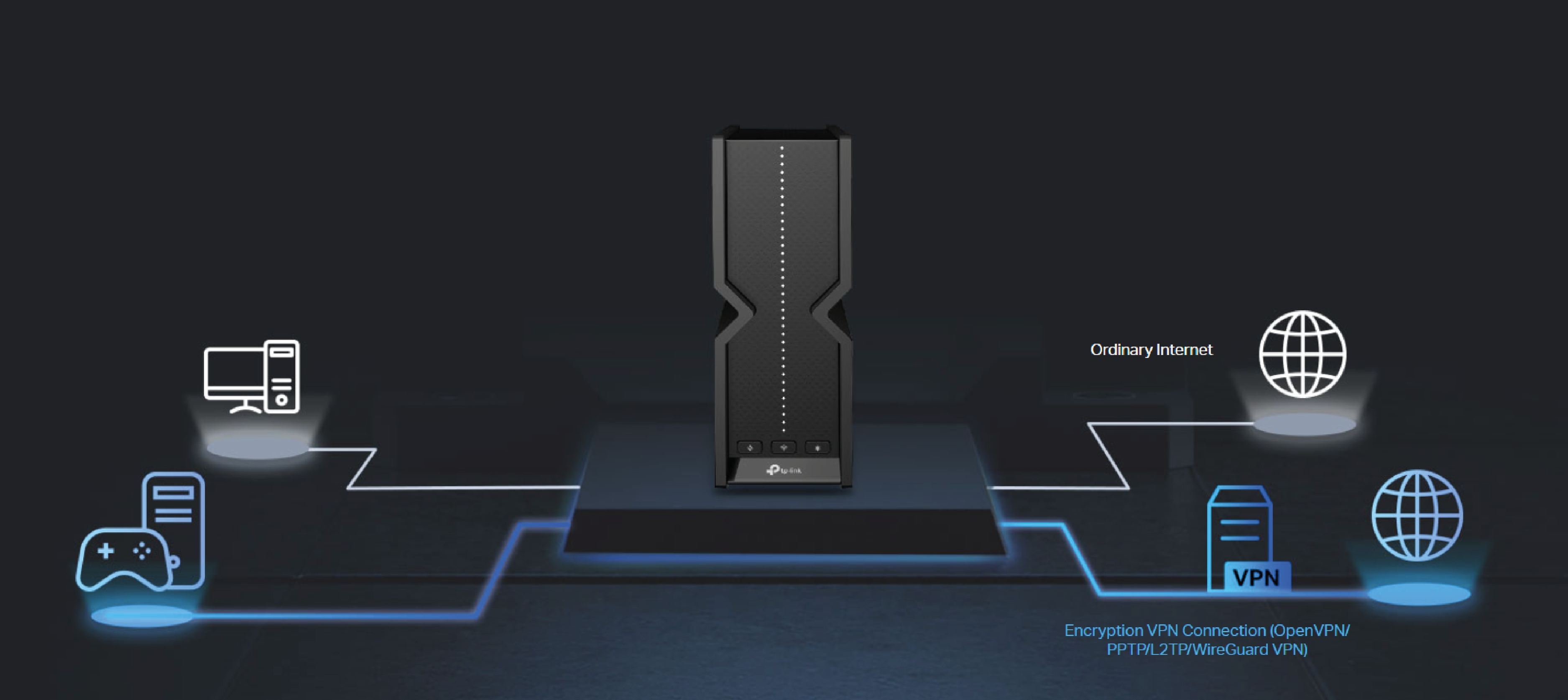 Zapewnij swoim urządzeniom w sieci domowej dostęp do zdalnych serwerów VPN bez konieczności instalowania oprogramowania VPN na każdym z nich. Archer BE700 może jednocześnie obsługiwać VPN, jak również zwykłe połączenie internetowe, zapewniając bezpieczeństwo i elastyczność.