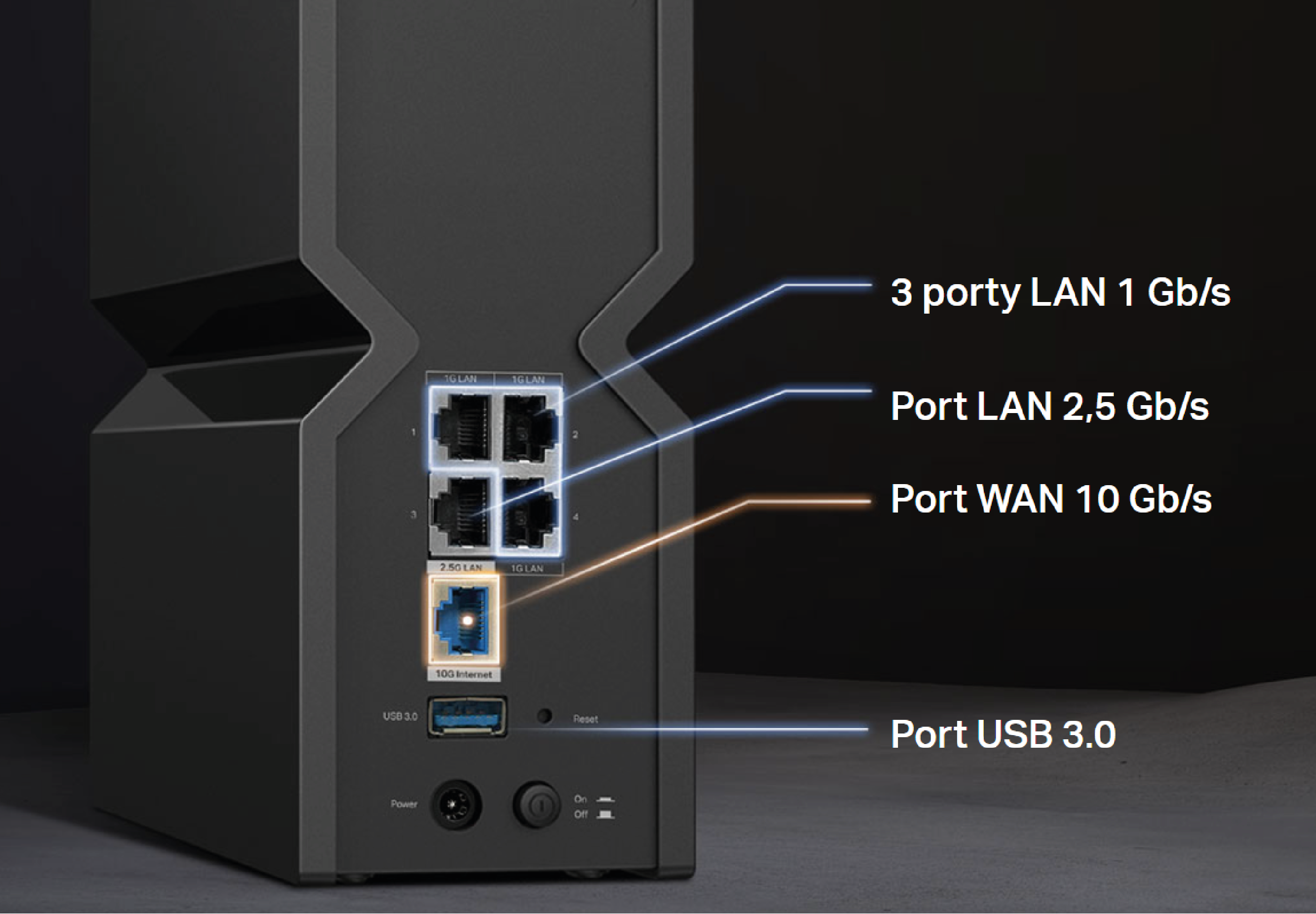 | Porty Ethernet | 1 WAN 10 Gb/s 1 LAN 2,5 Gb/s 3 LAN 1 Gb/s |