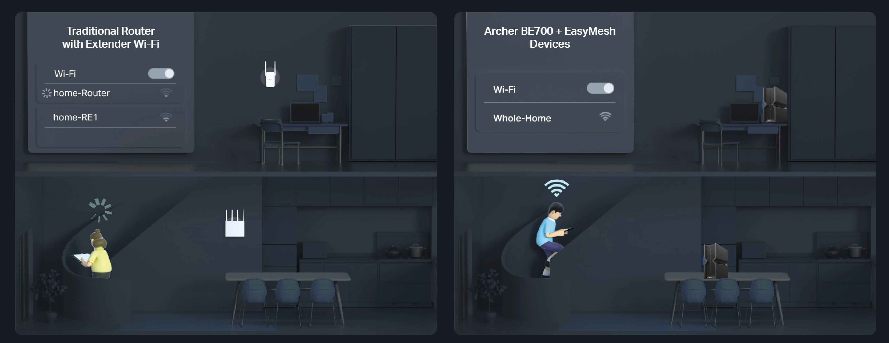 Archer BE700 obsługuje funkcję budowania sieci kratowej EasyMesh. Jeśli w Twoim domu występują martwe strefy zasięgu, po prostu dodaj router lub wzmacniacz sygnału kompatybilny z EasyMesh, aby rozbudować domową sieć Wi-Fi Mesh. Zapomnij o szukaniu stabilnego sygnału połączenia.