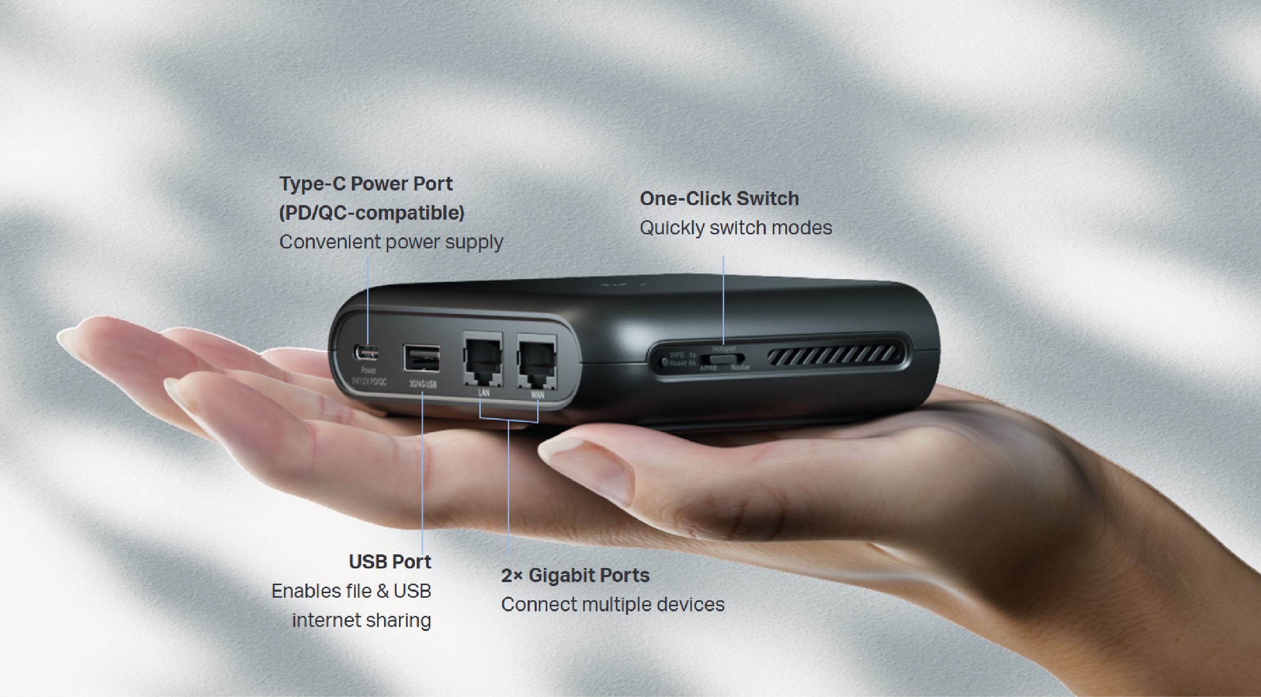 | Tryby pracy | Router Punkt dostępowy Wzmacniacz sygnału Tethering USB Modem USB 3G/4G Klient Hotspot (WISP) |