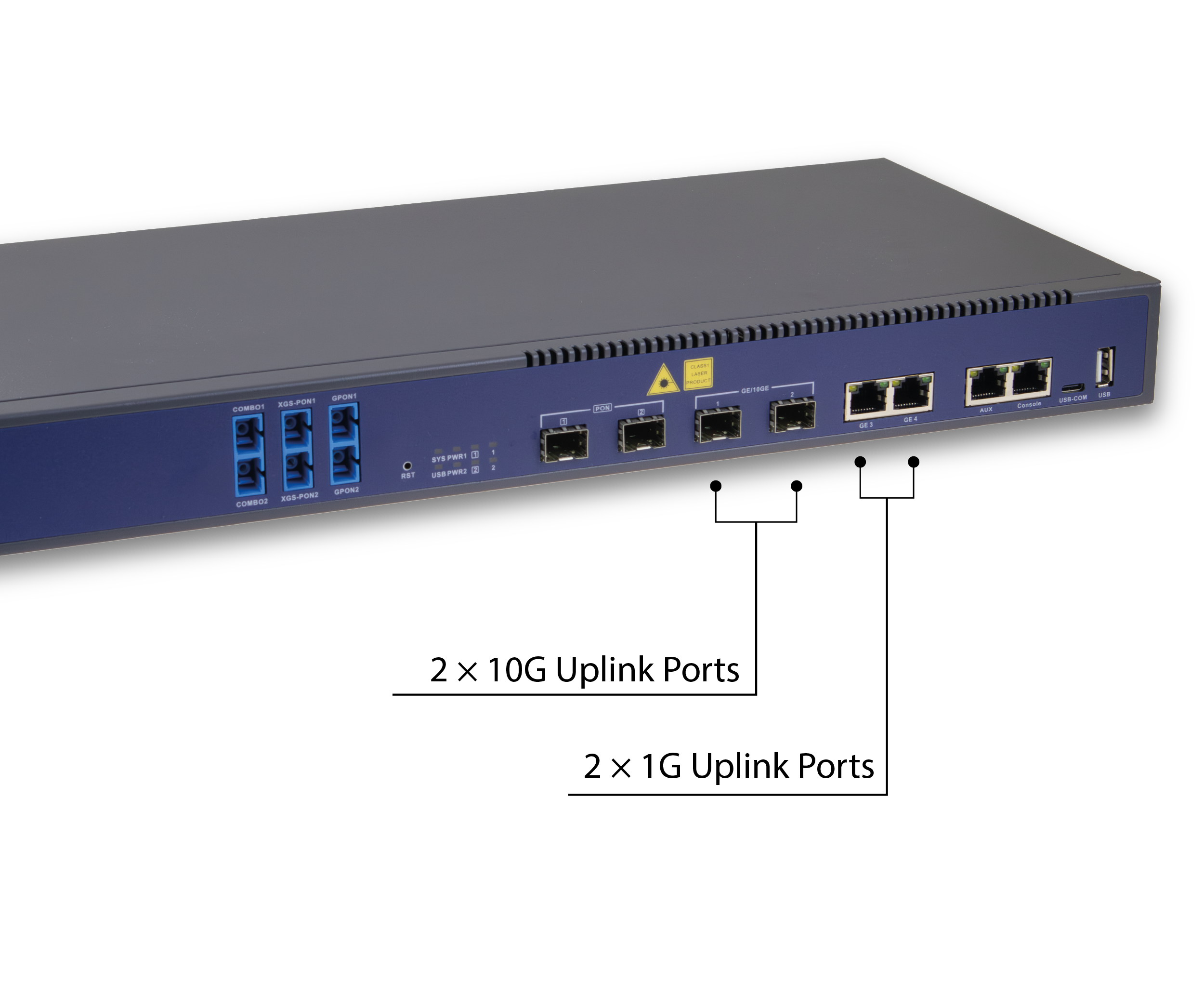 Terminal OLT został wyposażony w łącznie cztery porty uplinkowe, w tym 2 porty 1G Ethernet i 2 sloty, w których możesz wykorzystać wkładki SFP (1G) lub SFP+ (10G). Urządzenie zapewnia elastyczne możliwości podłączenia i jednocześnie umożliwia uzyskanie wysokiej przepustowości, wystarczającej do wykorzystania możliwości XG-PON / XGS-PON. Do zarządzania dostępne są 4 porty: Ethernet out-band, konsolowy (RJ45), USB-COM oraz USB.
