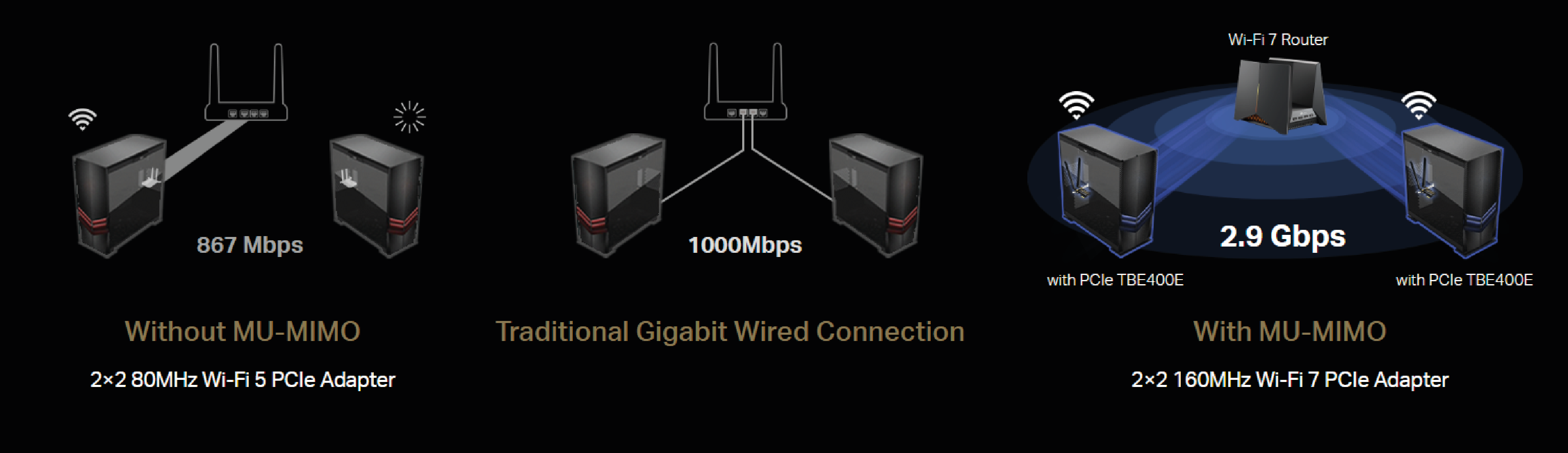 Archer TBE400E podnosi odbiór sygnału Wi-Fi Twojego komputera na kolejny poziom, dzięki rewolucyjnemu połączeniu OFDMA i MU‑MIMO. Zapewnia to wydajność połączenia Wi-Fi, poprzez umożliwienie jednoczesnej komunikacji większej liczby urządzeń z routerem, zamiast kolejkowania im dostępu do transmisji danych.