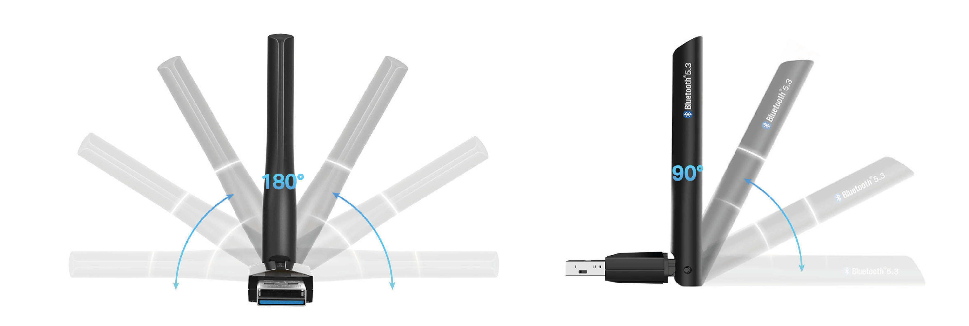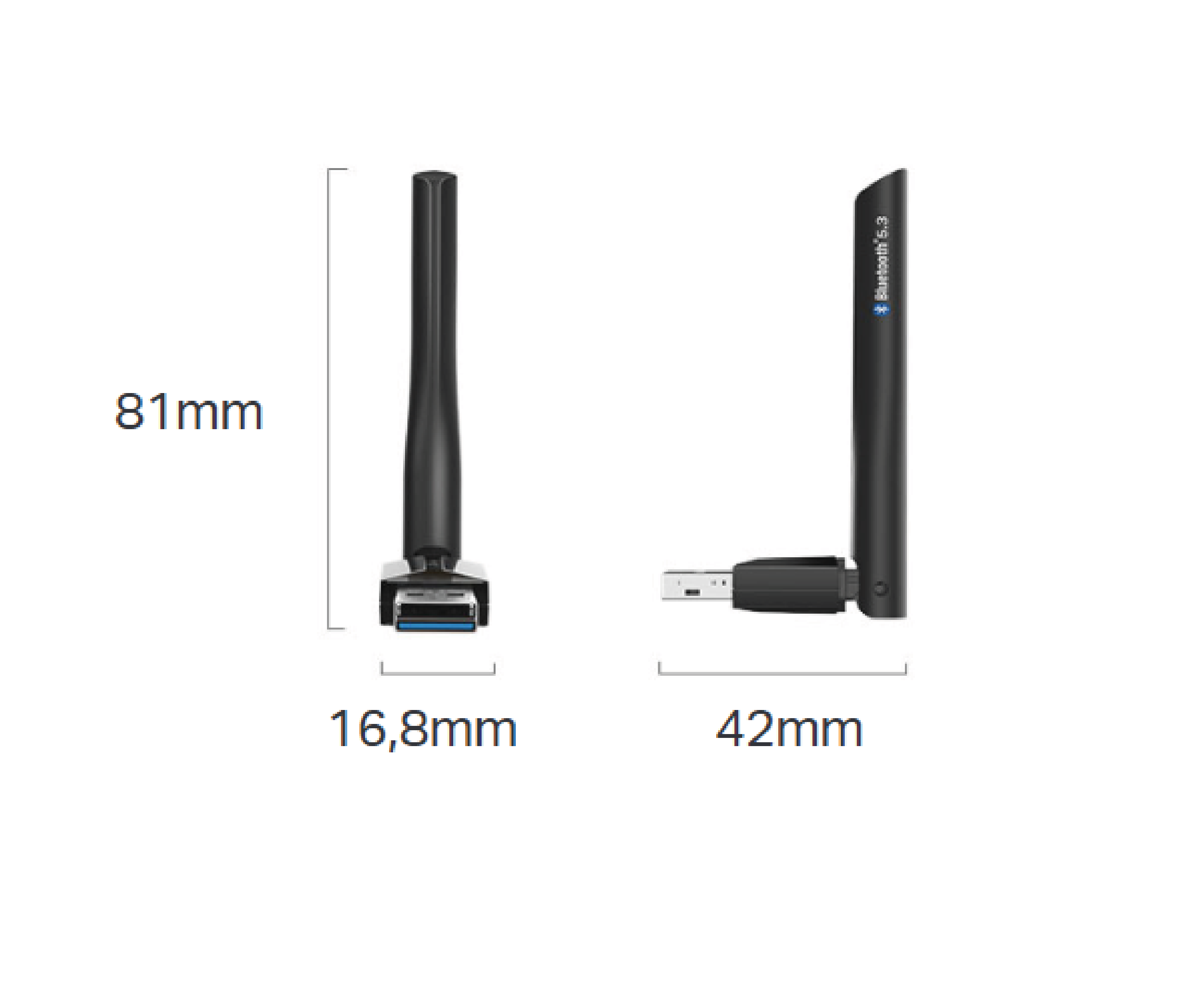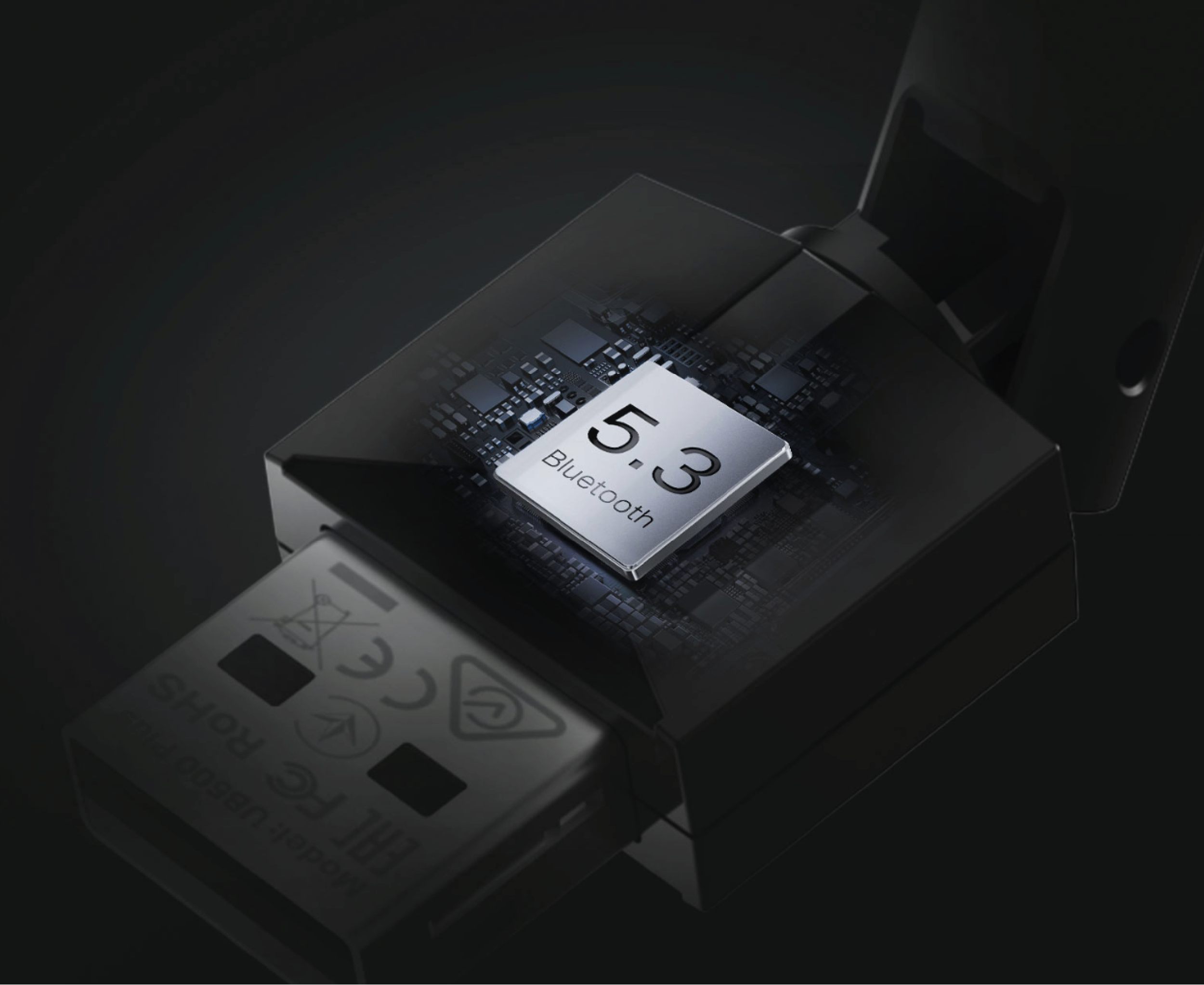 Adapter został wyposażony w interfejs USB oraz zewnętrzną antenę o dużym zasięgu, która zapewnia stabilną łączność i redukuje zakłócenia sygnału. Dzięki technologii Bluetooth 5.3 UB500 Plus umożliwia szybkie parowanie urządzeń, niższe opóźnienia i lepszą efektywność energetyczną.