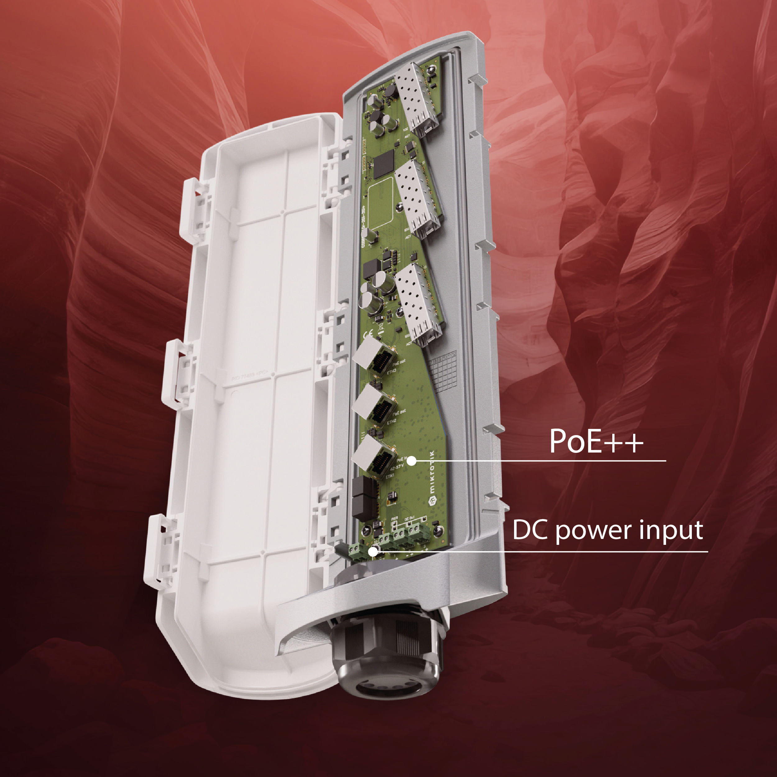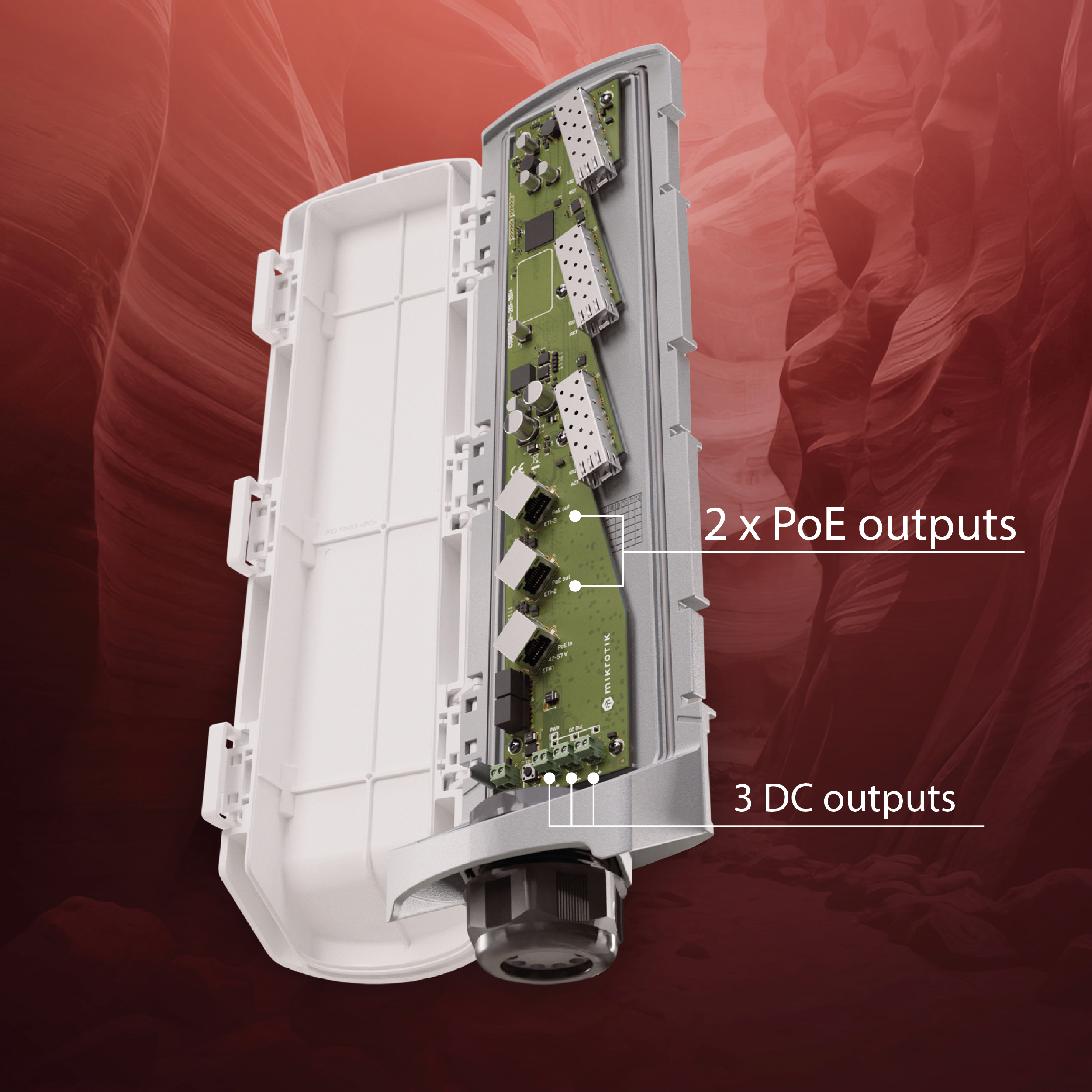 MikroTik GPERx6 to switch przeznaczony do montażu na zewnątrz budynków, cechuje się stopniem ochrony IP66. Z uwagi na elastyczną konstrukcję jest uniwersalnym rozwiązaniem do zastosowania na słupie. Został wyposażony w 3 gigabitowe porty Ethernet (10/100/1000 Mb/s) oraz 3 sloty SFP+ (10 Gb/s) zapewniające łączność światłowodową o dużej przepustowości, potencjalnie na dużych dystansach. GPERx6 może być zasilany poprzez PoE++ (802.3bt) lub gniazdo DC, w drugim przypadku zapewnia szeroki zakres napięcia wejściowego: 12 - 57 V DC. Switch zapewnia 2 wyjścia PoE+ (802.3af/at) oraz 3 wyjścia zasilania DC, co umożliwia podłączenie urządzeń z obsługą PoE i bez obsługi PoE. Dzięki powyższym cechom GPERx6 sprawdzi się w bardzo wielu instalacjach, zarówno przy łączeniu stacji bazowych, kamer IP, czujników czy różnego rodzaju sprzętów IoT. Dodatkowo zastosowanie wielu slotów SFP+ umożliwia podłączenie kablem światłowodowym kolejnych słupów, które znajdują się w odleglejszych lokalizacjach.