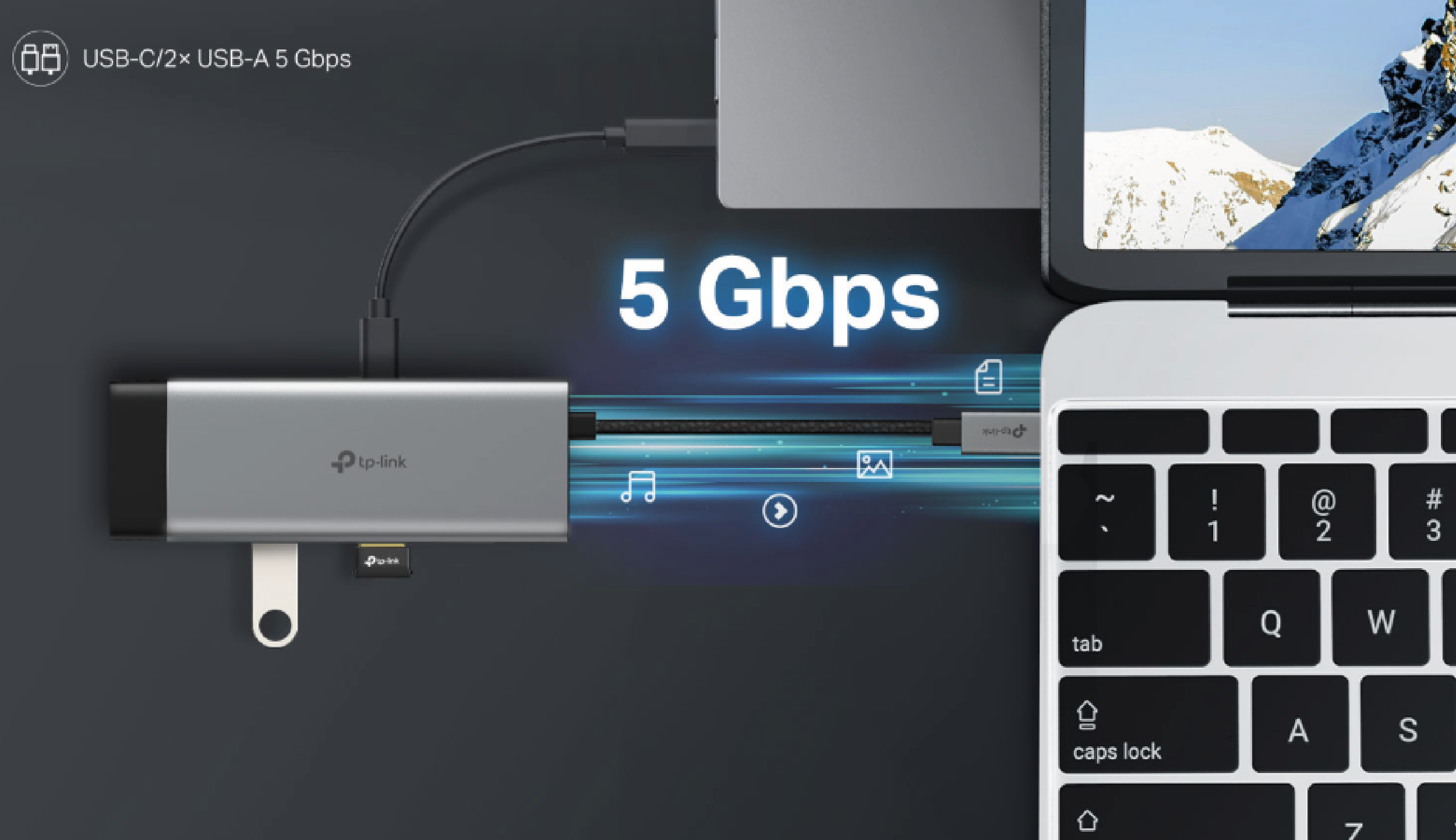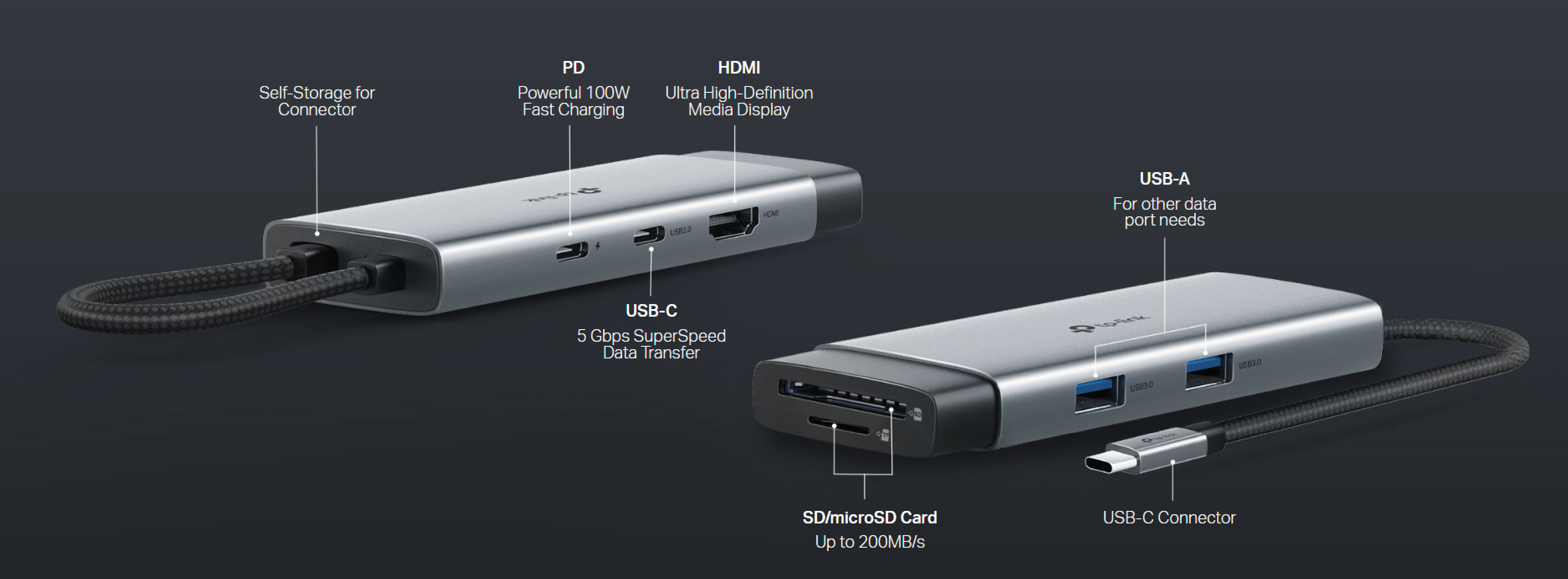 TP-Link UH7020C to kompaktowy hub 7-w-1 z interfejsem USB typu C, który rozszerza funkcjonalność laptopów, ultrabooków i komputerów stacjonarnych o dodatkowe porty. Urządzenie zostało wyposażone w trzy porty USB 3.0 obsługujące transmisję danych z prędkością do 5 Gb/s, port HDMI umożliwiający wyświetlanie obrazu w rozdzielczości 4K UHD przy 30 Hz, port RJ45 Gigabit Ethernet zapewniający przewodowe połączenie sieciowe o prędkości do 1000 Mb/s oraz port USB-C Power Delivery do ładowania urządzeń z mocą do 100 W. Dodatkowo hub oferuje gniazdo kart SD do obsługi pamięci przenośnych.