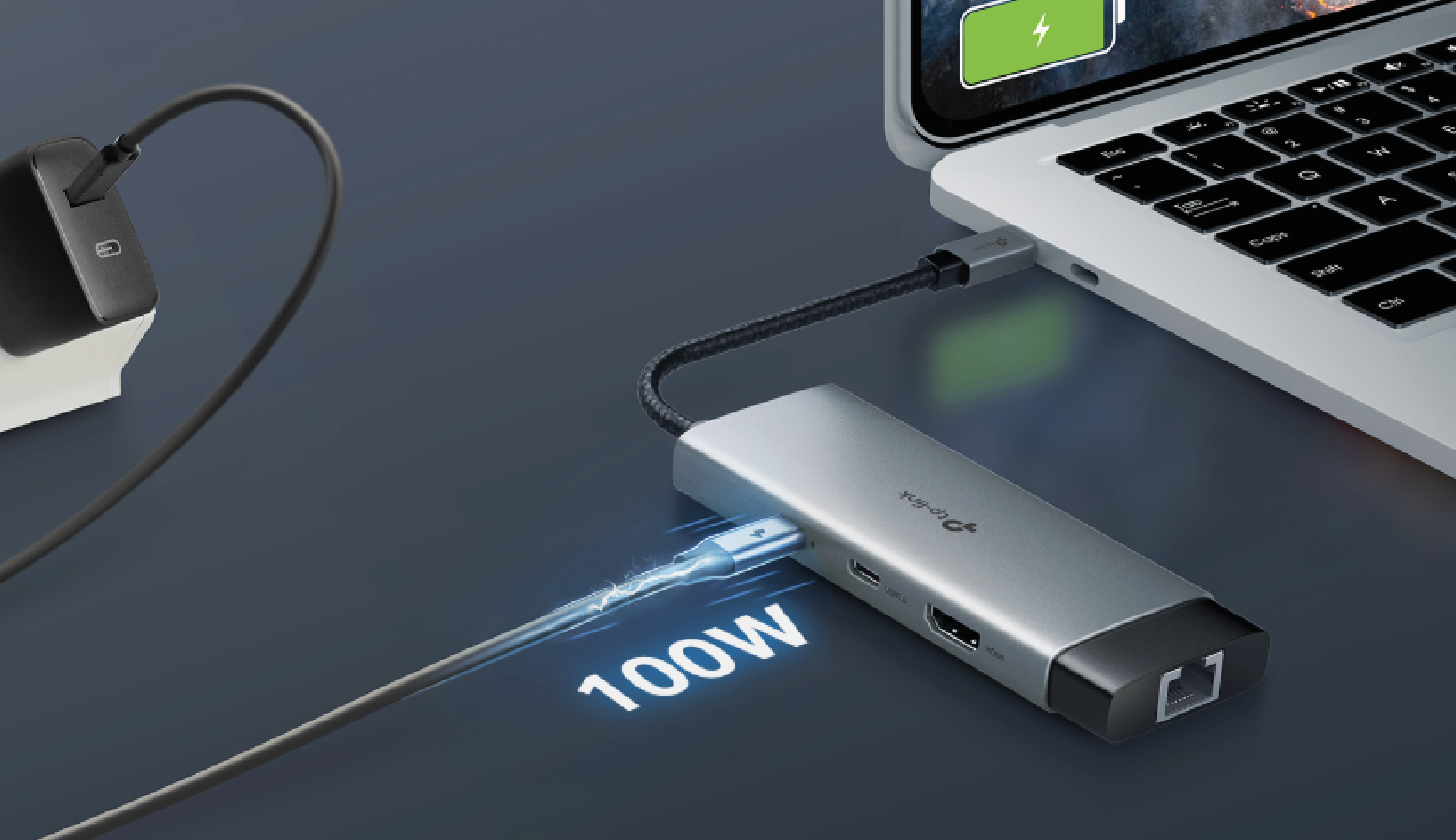 Podłącz kabel zasilający do UH6120C i dostarcz do 100W ciągłej mocy dla swojego laptopa podczas transferu plików lub strumieniowania mediów.