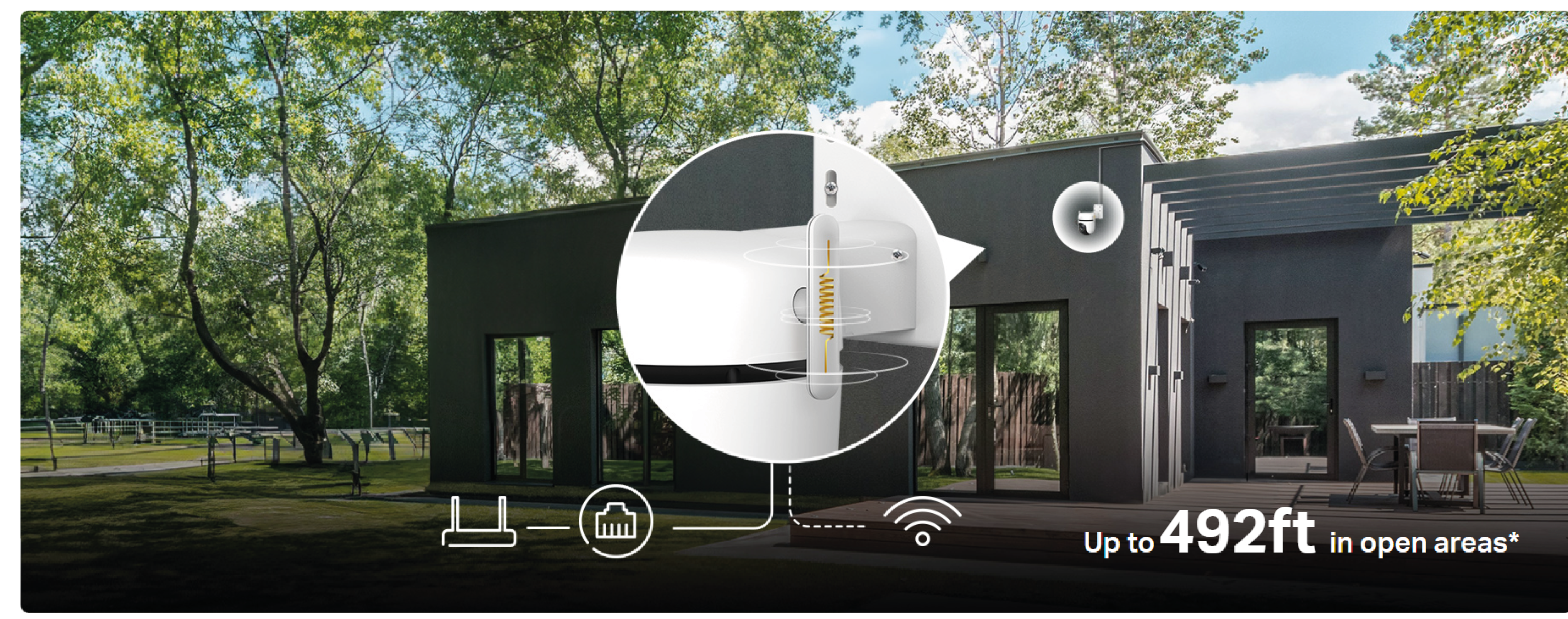 Dwie zewnętrzne anteny o wysokiej wydajności zwiększają zasięg połączenia do maksymalnie 150 metrów w otwartej przestrzeni.* Możesz również połączyć swoją kamerę do sieci za pomocą kabla Ethernet, aby uzyskać stabilne połączenie.