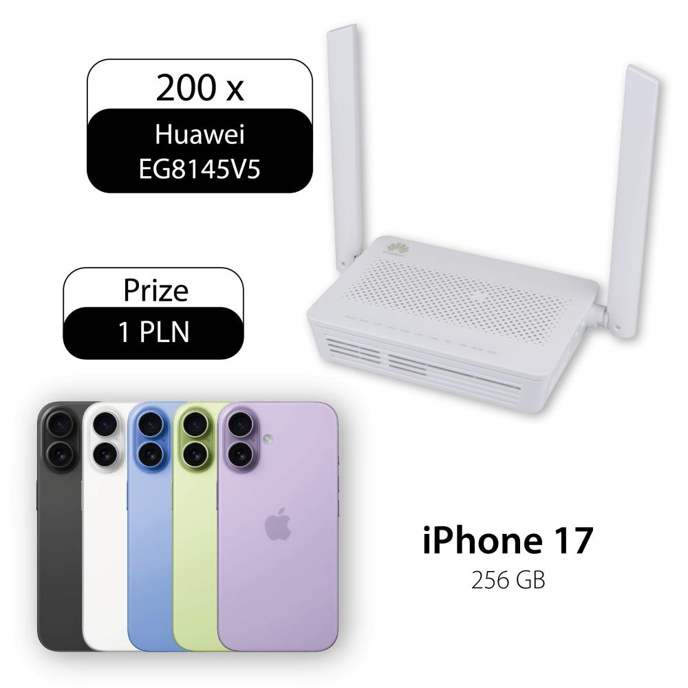 Kupując poniższy zestaw płacisz za 200 sztuk terminali klienckich EG8145V5 i otrzymujesz nagrodę (iPhone 17 256GB, kolor losowy), która zostanie zafakturowana za 1 zł netto!