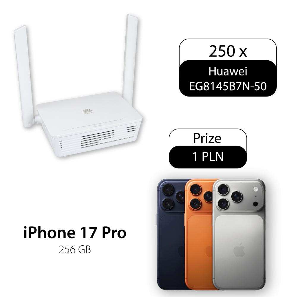 Kupując poniższy zestaw płacisz za 250 sztuk terminali klienckich EG8145B7N-50 i otrzymujesz nagrodę (iPhone 17 Pro 256GB, kolor losowy), która zostanie zafakturowana za 1 zł netto!