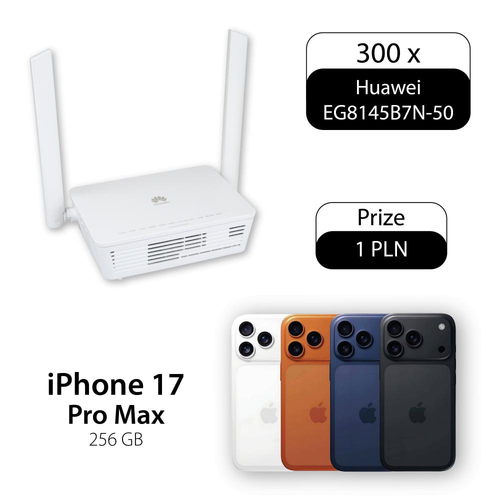 Kupując poniższy zestaw płacisz za 300 sztuk terminali klienckich EG8145B7N-50 i otrzymujesz nagrodę (iPhone 17 Pro Max 256GB, kolor losowy), która zostanie zafakturowana za 1 zł netto!