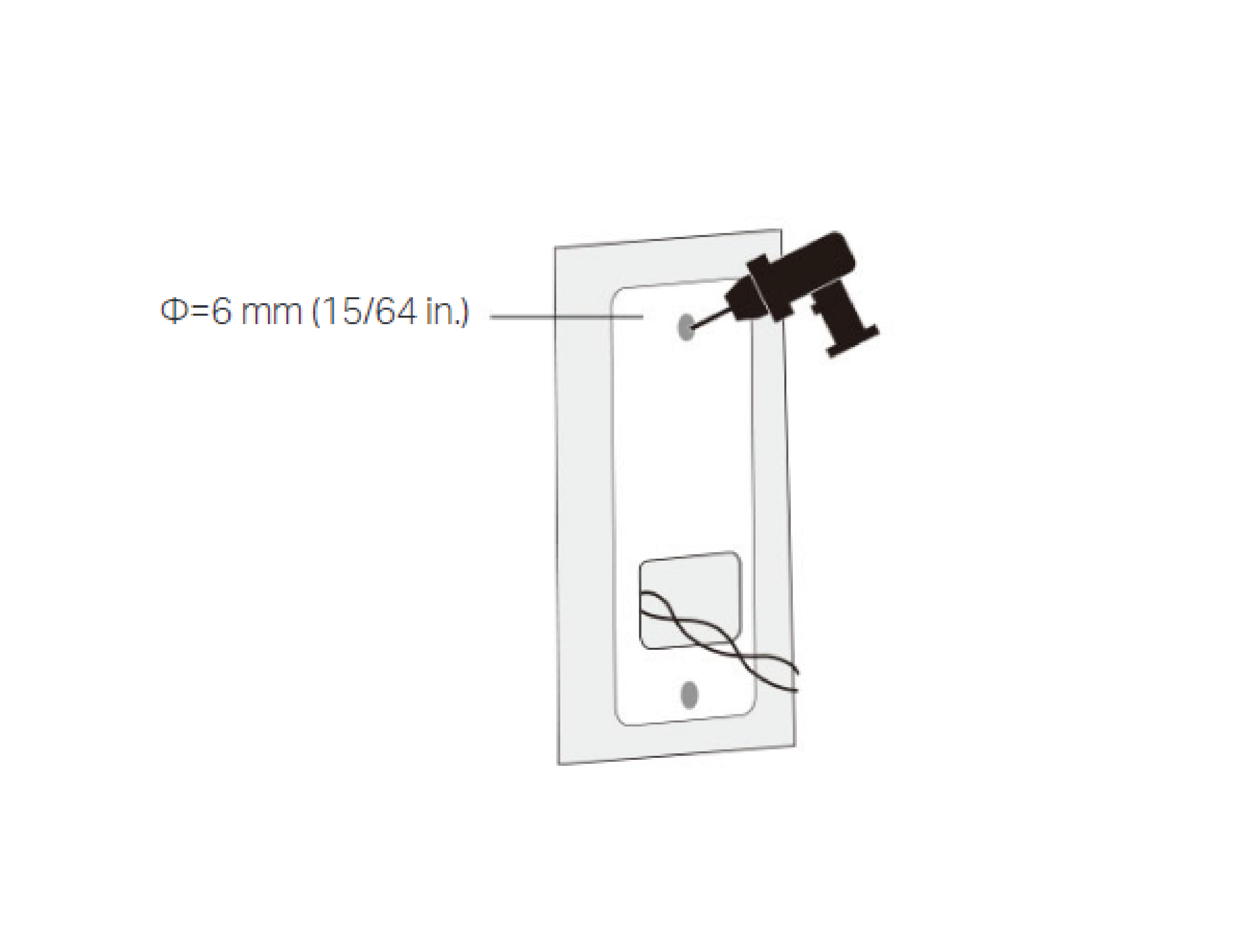 1. Przeprowadź przewody (jeśli istnieją) przez szablon montażowy i przyklej go. Wywierć dwa otwory w wyznaczonych miejscach
