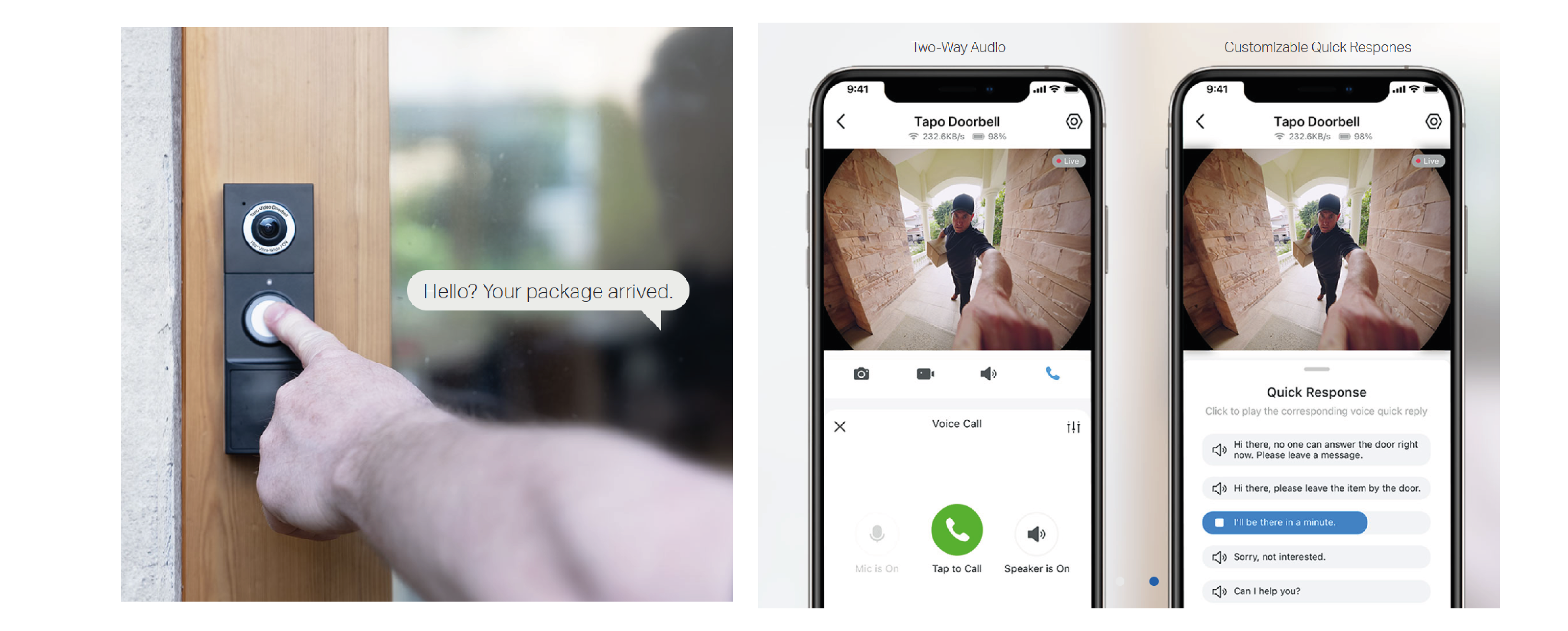 Dzięki dwukierunkowej transmisji audo i nagranym szybkim odpowiedziom, możesz bezpośrednio skomunikować się z osobą przy drzwiach korzystając z aplikacji Tapo.