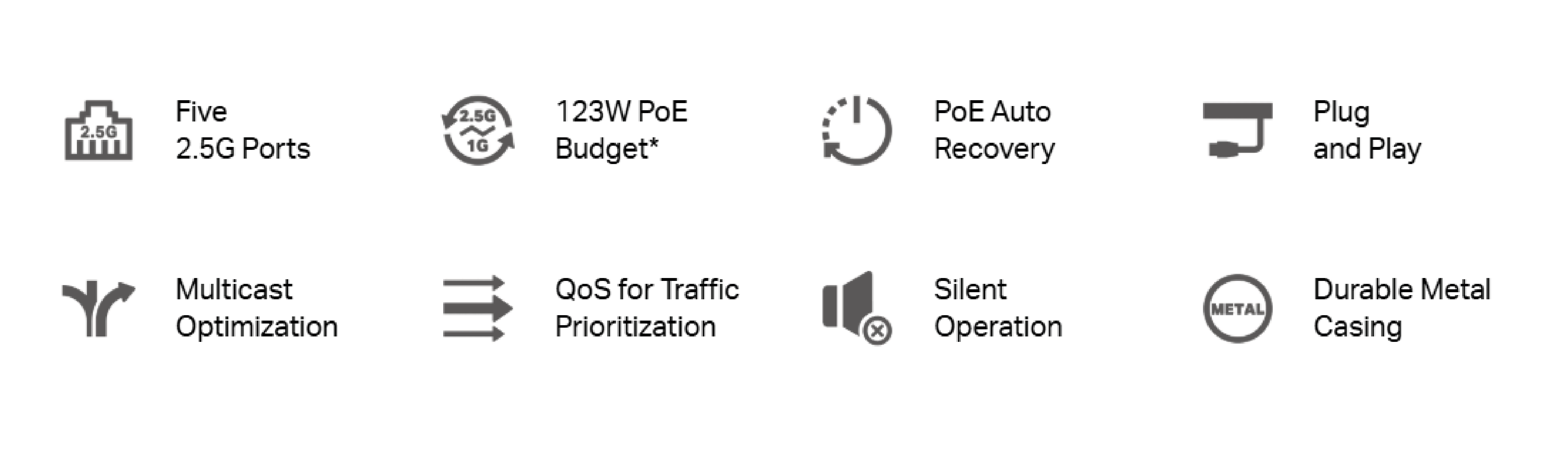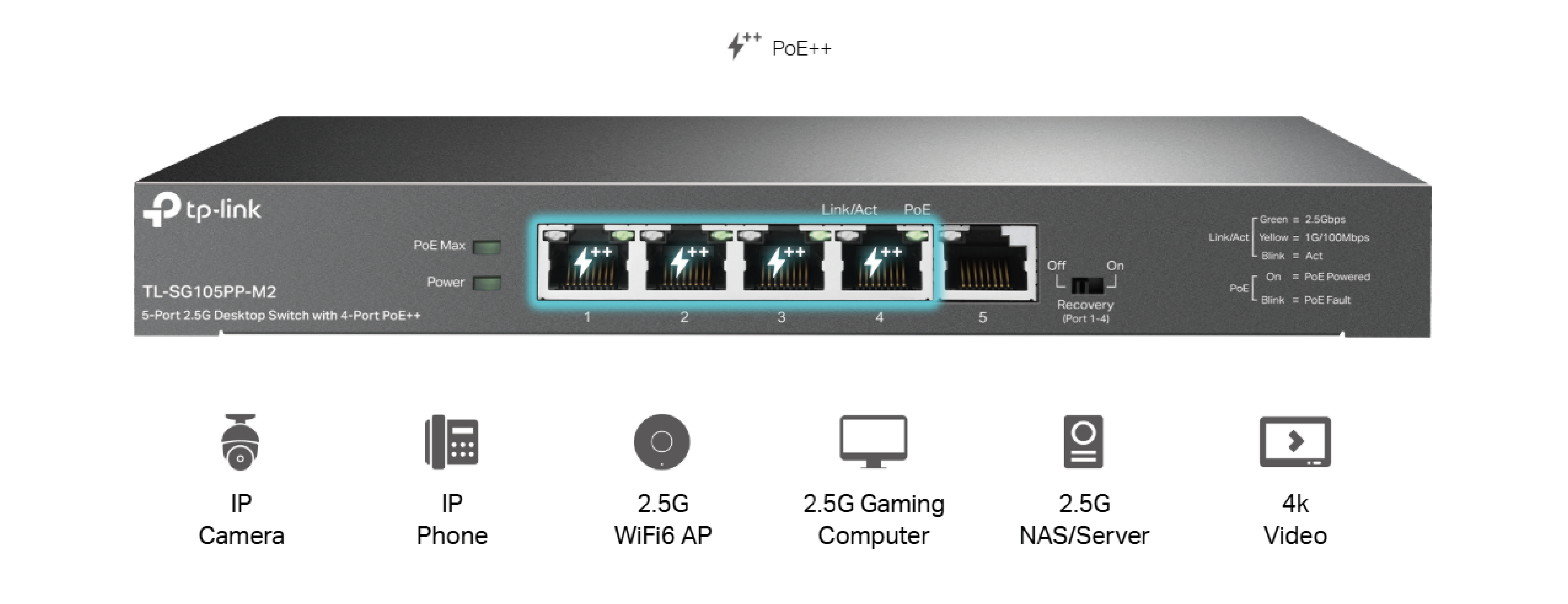 TP-Link TL-SG105PP-M2 to niezarządzalny przełącznik sieciowy typu Desktop, który oferuje 5 portów Ethernet 2.5G, zapewniając ultraszybką łączność. Urządzenie wyróżnia się obsługą zasilania PoE++ (802.3af/at/bt) na 4 z 5 portów Ethernet, co czyni go idealnym rozwiązaniem do zasilania nowoczesnych urządzeń o wysokim zapotrzebowaniu na energię, takich jak najnowsze punkty dostępowe Wi-Fi 6E / Wi-Fi 7 czy kamery PTZ. Maksymalna moc dostarczana na jeden port wynosi, zgodnie ze standardem, do 15,4 W przy 802.3af, do 30 W przy 802.3at lub do 60 W przy 802.3bt. Łączny budżet mocy dla wszystkich portów PoE w urządzeniu to 123 W. Przełącznik działa w trybie Plug and Play, nie wymaga żadnej konfiguracji ani zarządzania, co zapewnia niezwykle szybkie wdrożenie. Jego metalowa obudowa typu desktop jest przystosowana do postawienia na biurku lub półce, a bezzwiatrakowy design zapewnia cichą pracę. Przełącznik jest zasilany za pomocą zewnętrznego zasilacza i charakteryzuje się maksymalnym poborem mocy wynoszącym 135,1 W. TL-SG105PP-M2 to wydajne i proste narzędzie do modernizacji domowej lub biurowej sieci przewodowej do standardu 2.5 Gigabit Ethernet z jednoczesnym zasilaniem urządzeń PoE++.
