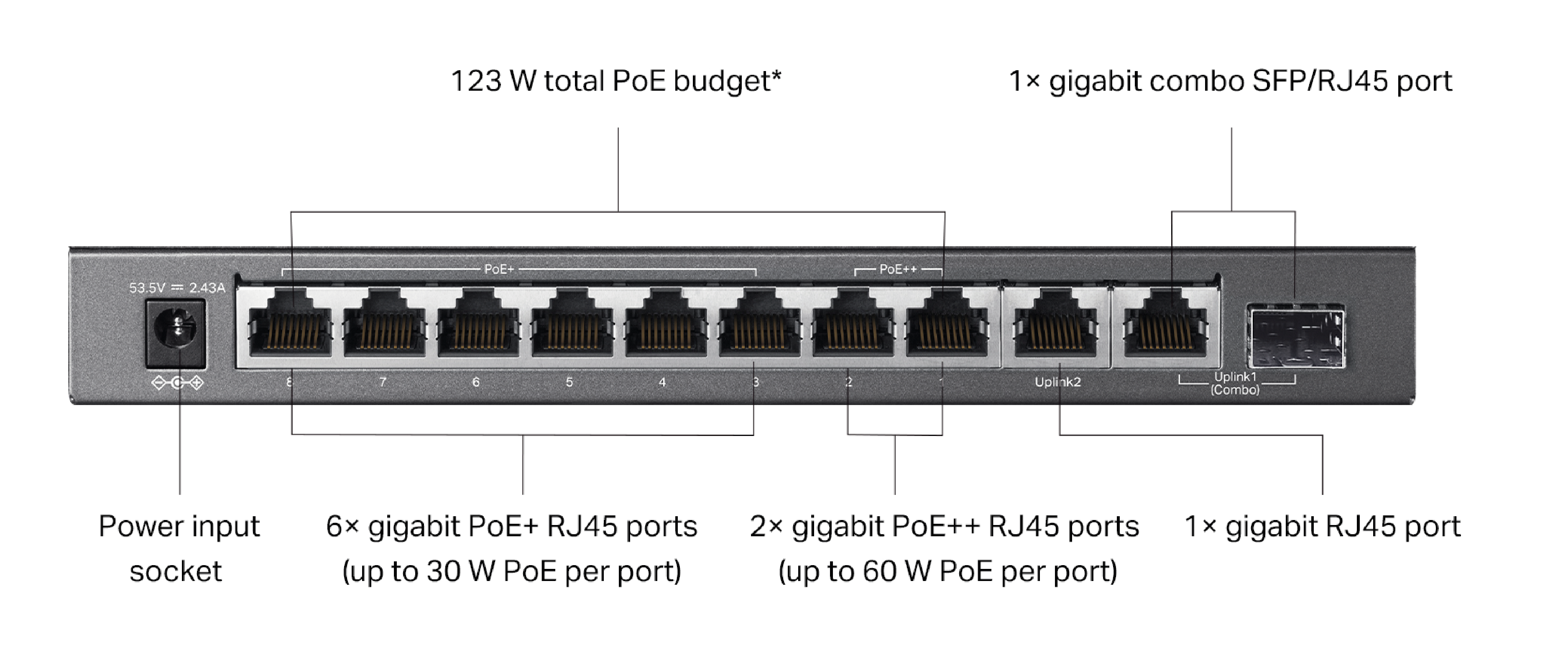 | Porty PoE (RJ45) | Porty PoE++: 1 - 2 (zgodne z 802.3af/at/bt) Porty PoE+: 3 - 8 (zgodne z 802.3af/at) Łączna moc zasilania PoE: 123 W |