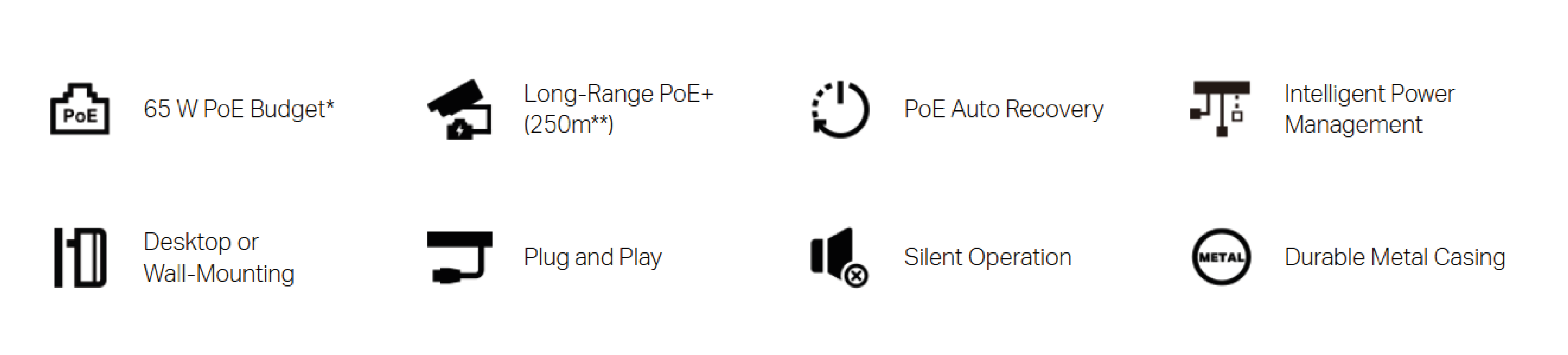 | Funkcje zaawansowane | Tryb Extend (Porty 1-2, do 250m transmisji zasilania PoE i danych) PoE Auto Recovery (Porty 1-4) Zgodność z urządzeniami PoE IEEE 802.3af/at Automatyczna nauka i wygaszanie adresów MAC Kontrola przepływu IEEE 802.3x 802.1p/DSCP QoS IGMP Snooping Technologia Green |